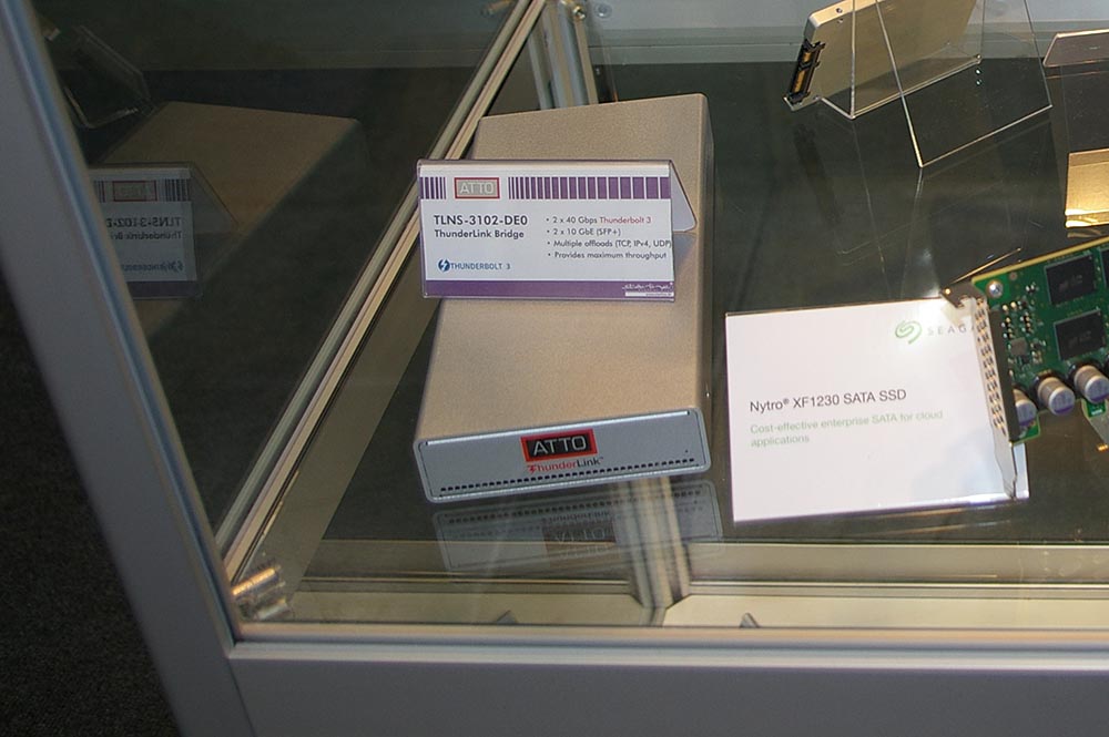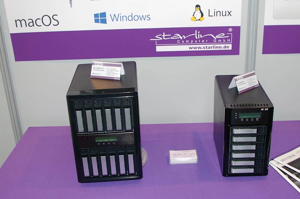 Die für kurze Geräte-Verbindungen geradezu prädestinierte Technik gibt es natürlich auch bei Starline. Auf dem Messestand zeigt der Storage-Integrator deshalb gleich fünf Produkte mit Thunderbolt-Technik: Drei Areca-RAID-Systeme, eine ATTO-Bridge und ein Netstor-Erweiterungsgehäuse. Selbstverständlich hat Starline bezüglich Thunderbolt noch wesentlich mehr Modelle in petto.