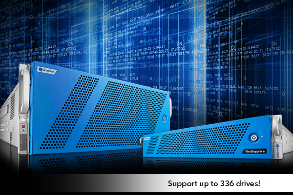 Im AccelStor NeoSapphire H710 lassen sich auf vier Höheneinheiten 48 SSDs zu einem Verbund mit 27 Terabyte nutzbarer Gesamtkapazität zusammenschalten. Durch die ebenfalls neuen JBODs NeoSapphire J212 und J214, die per schneller SAS-Schnittstelle ans H710 angedockt werden, sind noch größere Kapazitäten möglich. Das J212 erreicht mit insgesamt 24 SSDs bis zu 110 Terabyte und das J214 sogar 165 Terabyte mit 72 eingebauten Laufwerken. Insgesamt lässt sich das System gar auf bis zu 336 Laufwerke ausbauen.
