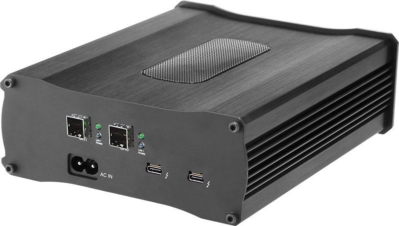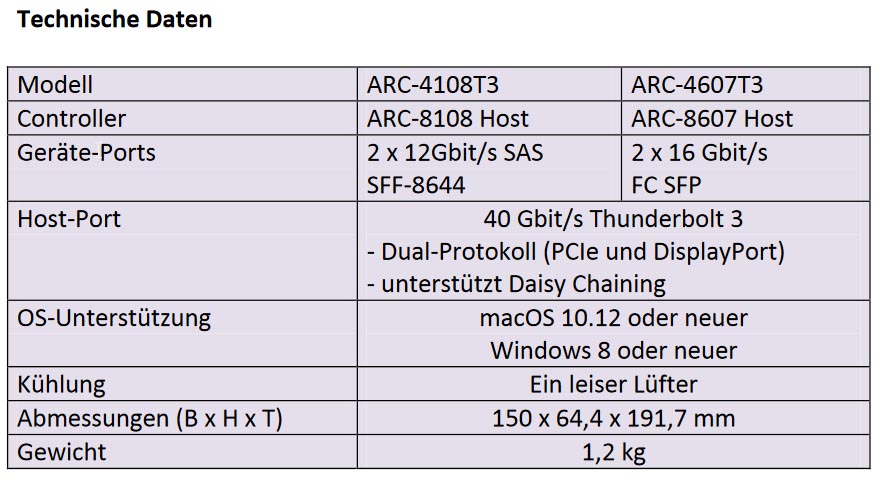 Die beiden günstigen Kandidaten ARC-4108T3 und ARC-4607T3 gleichen sich zunächst einmal auf der Host-Seite: Sie haben zwei Thunderbolt 3-Schnittstellen intus, die mit 40 Gbit/s eine extrem hohe Übertragungsbandbereite liefern. Notebooks wie etwa das MacBook Pro von Apple lassen sich so über ein einziges Kabel andocken. Die zweite Buchse dient dabei der Verkettung (Daisy Chaining) mit nachgeschalteten Thunderbolt-Geräten wie etwa Monitore über DisplayPort-Anschluss oder auch weitere Storage-Systeme. Auf der Ausgangsseite unterstützen die beiden kleinen Boxen je nach Bedarf unterschiedliche Protokolle: