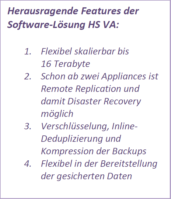 Die elegante Software-Lösung HS VA aus der bewährten HYDRAstor-Serie von NEC Storage überzeugt mit preiswerten, virtualisierten Backups für kleine und mittlere Unternehmen sowie für entfernte Zweigstellen. Sie lässt sich einfach auf vorhandener Hardware-Infrastruktur integrieren und ist besonders gut geeignet für virtualisierte Rechenzentren. Durch Deduplizierung und effektive Kompression, die bereits auf der Client-Seite ansetzt, erreicht die Software eine hohe Performance und Storage-Effizienz im heimischen Netzwerk. Ihre leistungsfähige Multi-Site-Replication trägt zudem zur Minimierung des Datentransfers im WAN-Bereich bei. Durch diese Maßnahme erreicht HS VA die konkurrenzlos schnelle Backup-Geschwindigkeit von 10 TB pro Stunde.