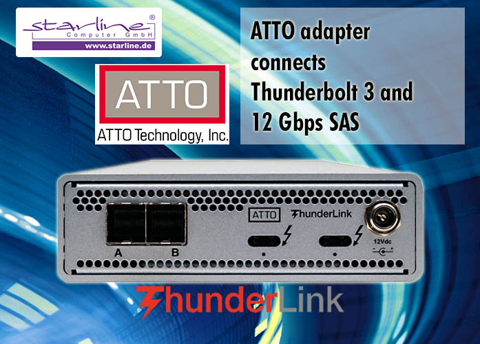 (pressebox) (Kirchheim/Teck, 04.06.2018) ATTO is known for its smart solutions in the field of storage, network connectivity and infrastructure. With the sophisticated ATTO ThunderLink 3128, any SAS installation can now dock to the fast Thunderbolt 3 port and benefit from its performance.