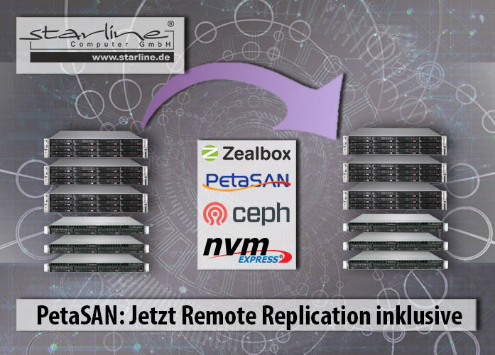 PetaSAN arbeitet bei Starline selbstredend auf zuverlässigen Zealbox-Servern, die aus soliden Supermicro-Teilen assembliert wurden. So lässt sich das Beste aus allen Welten nutzen: Alle Vorteile eines skalierbaren Ceph-Clusters in Kombination mit den nativen und hochredundanten MPIO-iSCSI-Fähigkeiten für Windows Server und VMware.