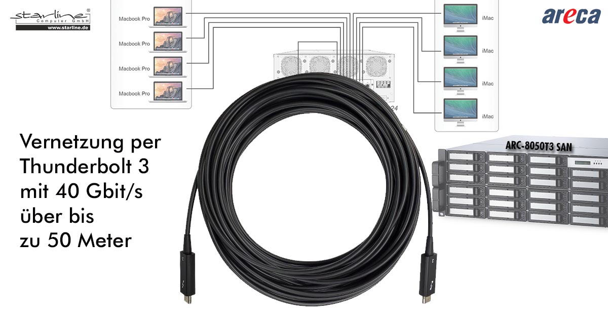 Bisher konnte Starline seinen Kunden nur maximal zwei Meter lange Kabel anbieten. In den neuen optischen Varianten kann der Value-Added Distributor nun konfektionierte Längen mit 5, 10, 20, 30 und sogar 50 Meter offerieren. Die dadurch möglichen Ausbaustufen liegen auf der Hand: Mit der Thunderbolt-Zentrale ARC-8050T3 SAN von Areca mit ihren bis zu neun Ports beispielsweise ließen sich ganze Etagen oder Großraumbüros mit 40 Gbit/s versorgen.