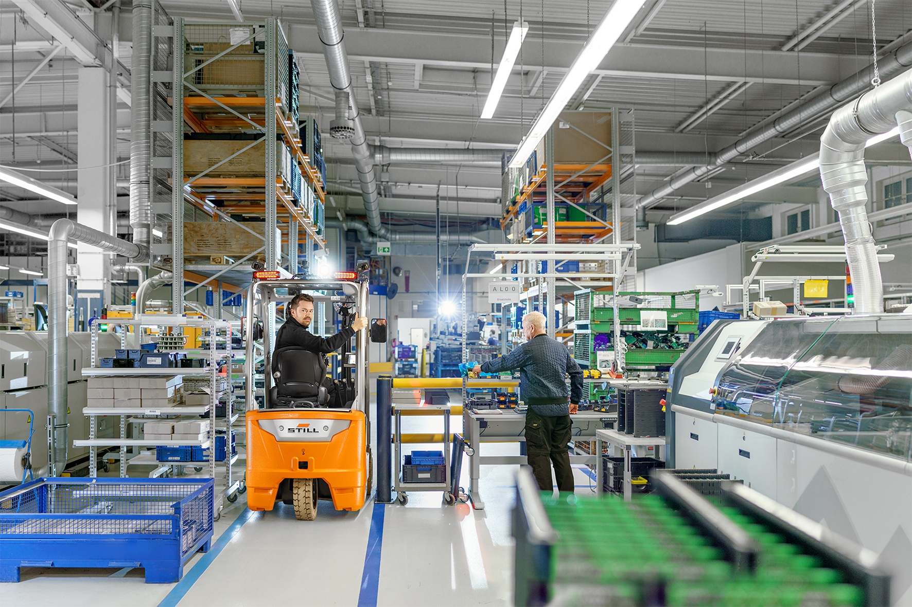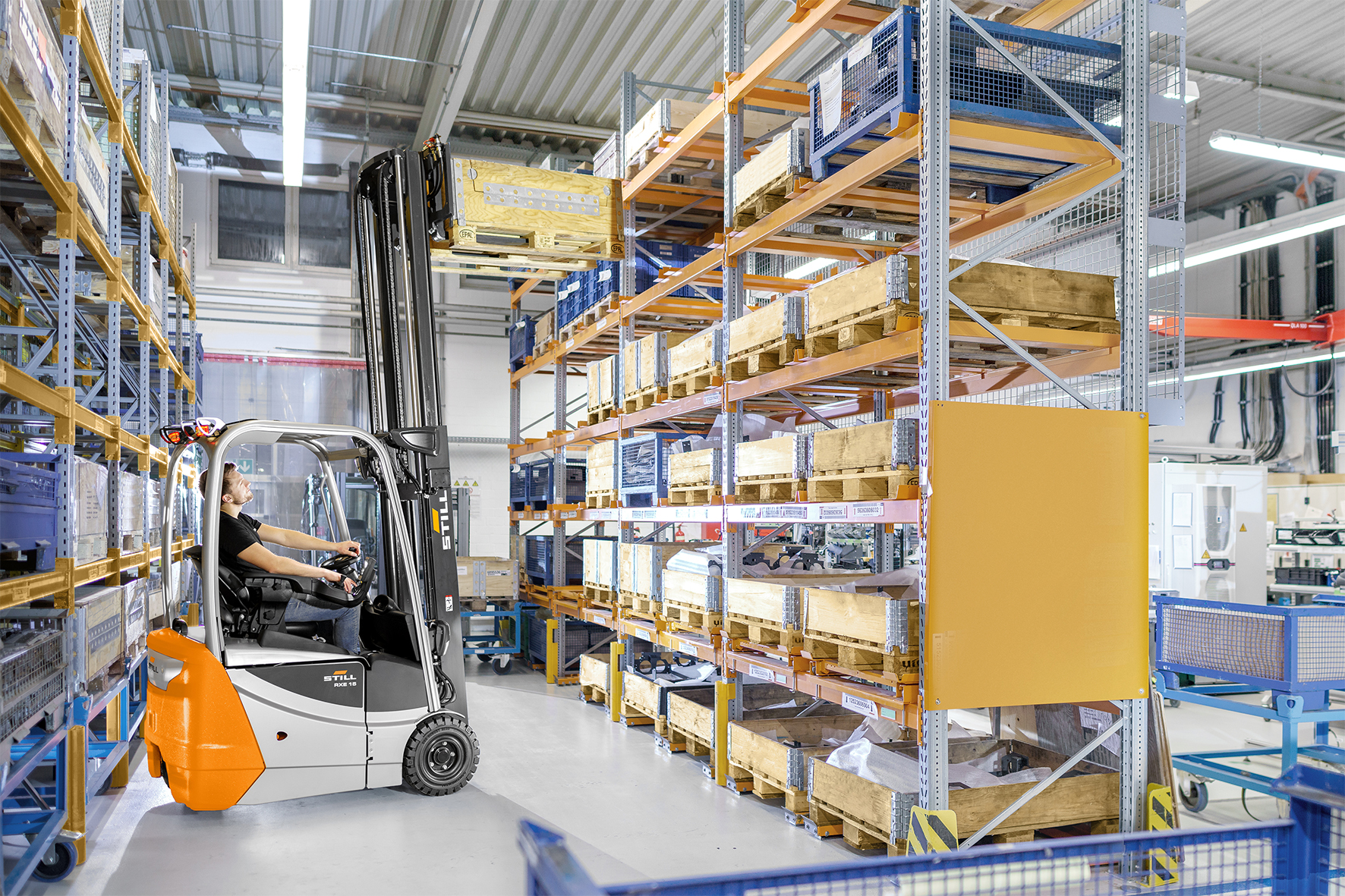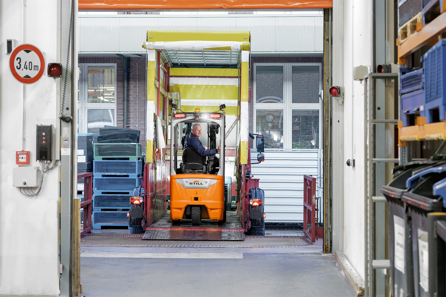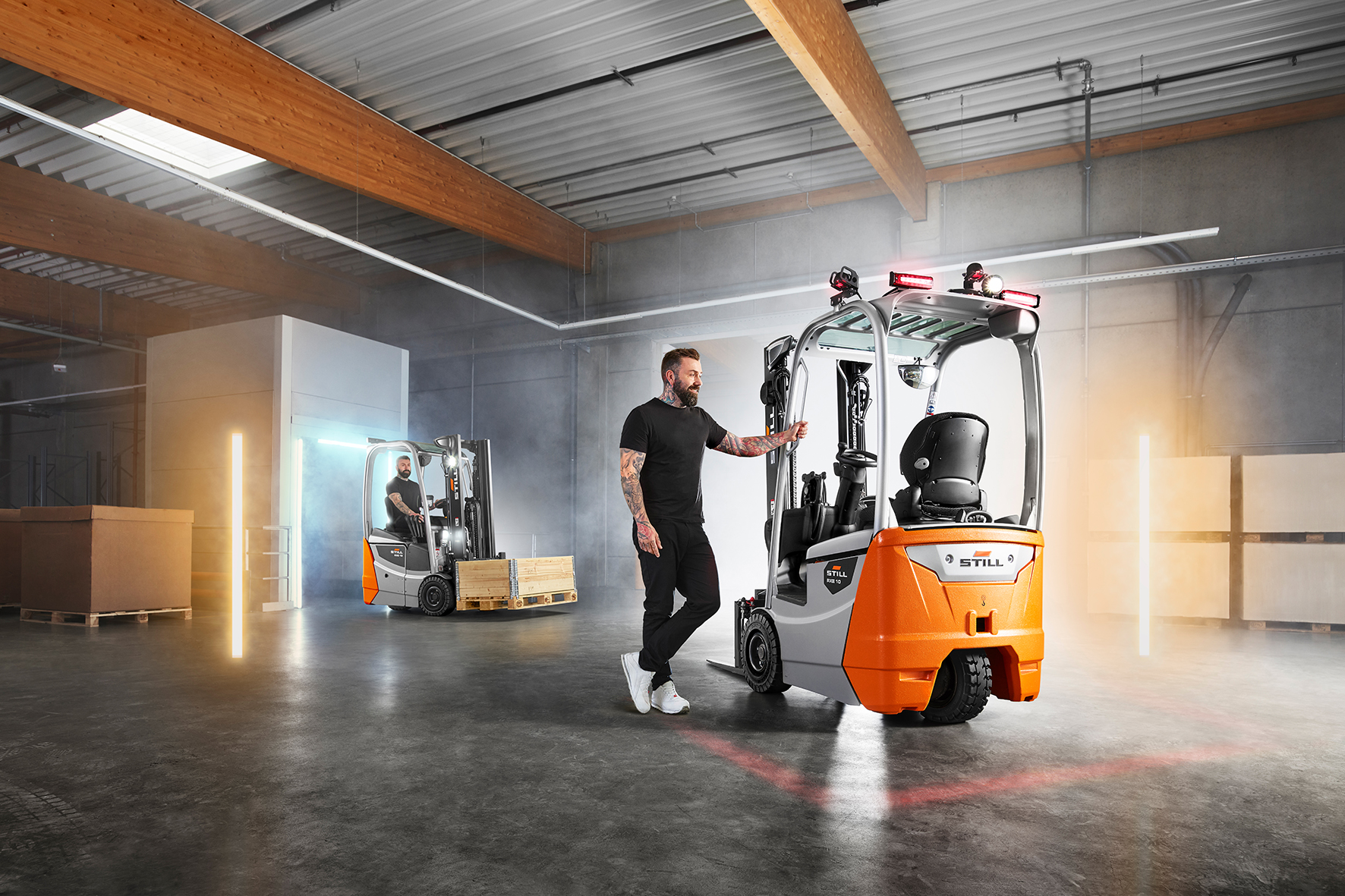 Der STILL RXE 10-16C ist jedoch nicht nur besonders wendig, sondern mit einer Spitzengeschwindigkeit von 12,5 km/h im beladenen Zustand auch ganz schön schnell auf der Langstrecke unterwegs. Damit aus Sicherheitsgründen kein Moment seiner elektrisierenden Fahrdynamik verloren geht, ist er serienmäßig mit der bewährten Assistenzfunktion Curve Speed Control ausgestattet. Dank der automatischen Geschwindigkeitsanpassung in Kurven bleibt er jederzeit sicher in der Spur – auch in Kurven, die etwas enger geschnitten sind. Sein besonders schlankes Hubgerüst und die sichtoptimierten Schutzdachholme gewähren den Fahrerinnen und Fahrern zudem einen optimalen Rundumblick, durch den Personen oder Gegenstände im Aktionskreis des Staplers sicher erkannt werden. Maximale Arbeitssicherheit garantieren auch die übrigen, individuell konfigurierbaren Ausstattungsoptionen – von der Fahrtrichtungsanzeige über die Sicherheitsbeleuchtung Safety Light 4Plus und die Hubhöhenanzeige bis zum Stabilitätsassistenten oder zur Überlasterkennung. „Auch beim kleinsten Vertreter unserer E-Stapler-Familie sind wir bei den Sicherheitsfeatures keine Kompromisse eingegangen“, erläutert Dyrk Draenkow, Produktmanager für Elektrostapler und Energiesysteme. „Der RXE 10-16C kommt mit seinen zahlreichen, teilweise optional erhältlichen Fahrerassistenzsystemen mindestens ebenso sicher daher wie die vermeintlich größeren Mitglieder der STILL Elektrostaplerfamilie.“