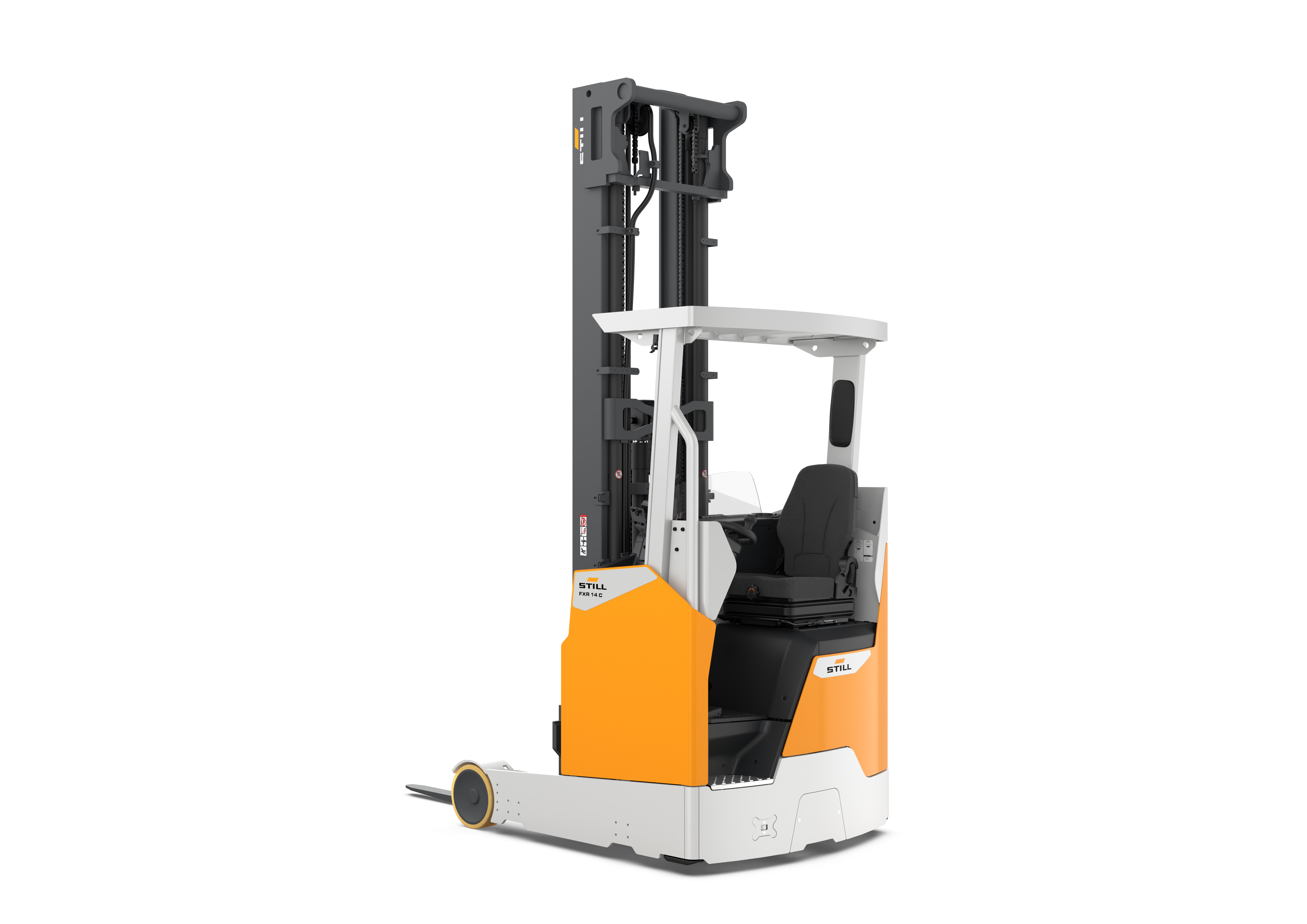 Der Schubmaststapler FXR 14C-16C ist der kompakte Lagerhelfer für Betriebe, in denen Lager eng, Gänge schmal und Regale maximal 9 Meter hoch sind. Bis zu dieser Höhe und mit einer Resttragfähigkeit von bis zu 940 kg lagert das neueste Mitglied der STILL Schubmaststapler-Familie Waren sicher ein und aus, und das dank mechanischer Höhenmessung besonders präzise und schnell. Der Schubmast in Kombination mit der geringen Arbeitsgangbreite von Minimum 2.723 Millimetern ermöglicht zudem flexibles Arbeiten und wendiges Manövrieren auch in besonders schmalen Gängen – ein wichtiger Pluspunkt in hochverdichteten Lagern, in denen bei der Raumausnutzung jeder Meter zählt. Dazu trägt auch das besonders kompakte l2-Maß von mindestens 1.231 Millimetern bei, also die Maße vom Heck des Staplers bis zu den Gabelrücken. Trotz seiner schlanken Maße punktet der FXR 14C-16C mit Power und Verfügbarkeit. Sein wartungsarmer 12-kW-Hubmotor sorgt für hohe Hub- und Senkgeschwindigkeiten und einen effizienten Warenumschlag, seine integrierte Lithium-Ionen-Batterie inklusive Schnellladezugang garantiert eine verlässliche Verfügbarkeit im Ein- und Zweischichtbetrieb.