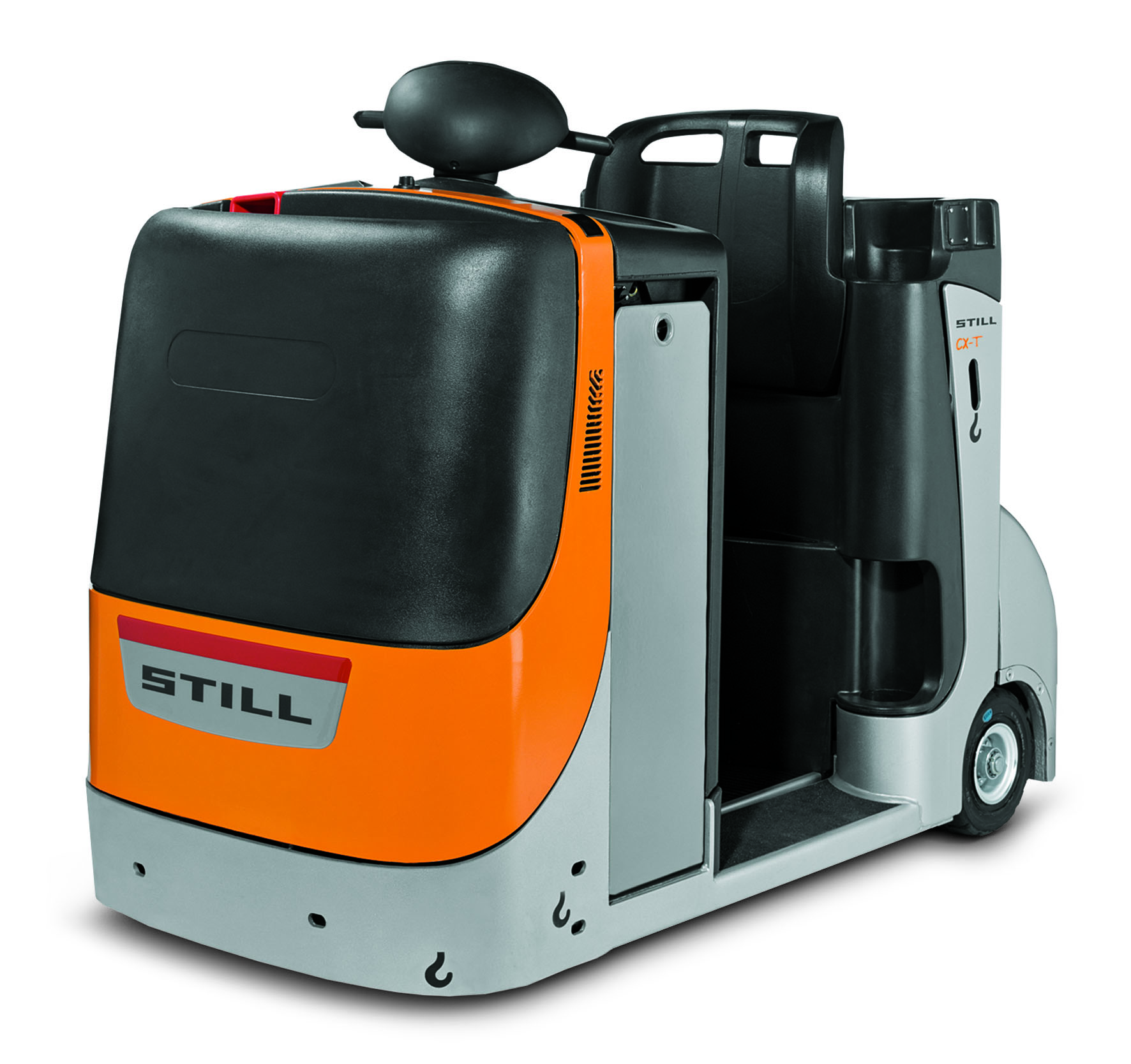 Die vom Fahrerstand aus ungehinderte Sicht auf die Kupplung bewirkt eine weitere Arbeitserleichterung im täglichen Betrieb, vor allem dann, wenn der CX-T-Schlepper mit einer optional erhältlichen Automatikkupplung ausgestattet ist. In der Standardausrüstung besitzt der CX-T-Schlepper eine Dreifach-Kupplung mit Kupplungshöhen von 300, 365 und 410 Millimeter zur optimalen Anpassung an unterschiedliche Deichselhöhen. Um den manuellen Kupplungsvorgang wirksam zu erleichtern, kann der Still CX-T-Schlepper optional mit einer Mitgängerfunktion ausgestattet werden. Dazu befinden sich am Schlepper zwei Taster für eine langsame Vorwärts- und Rückwärtsfahrt, die von außen bedient werden.