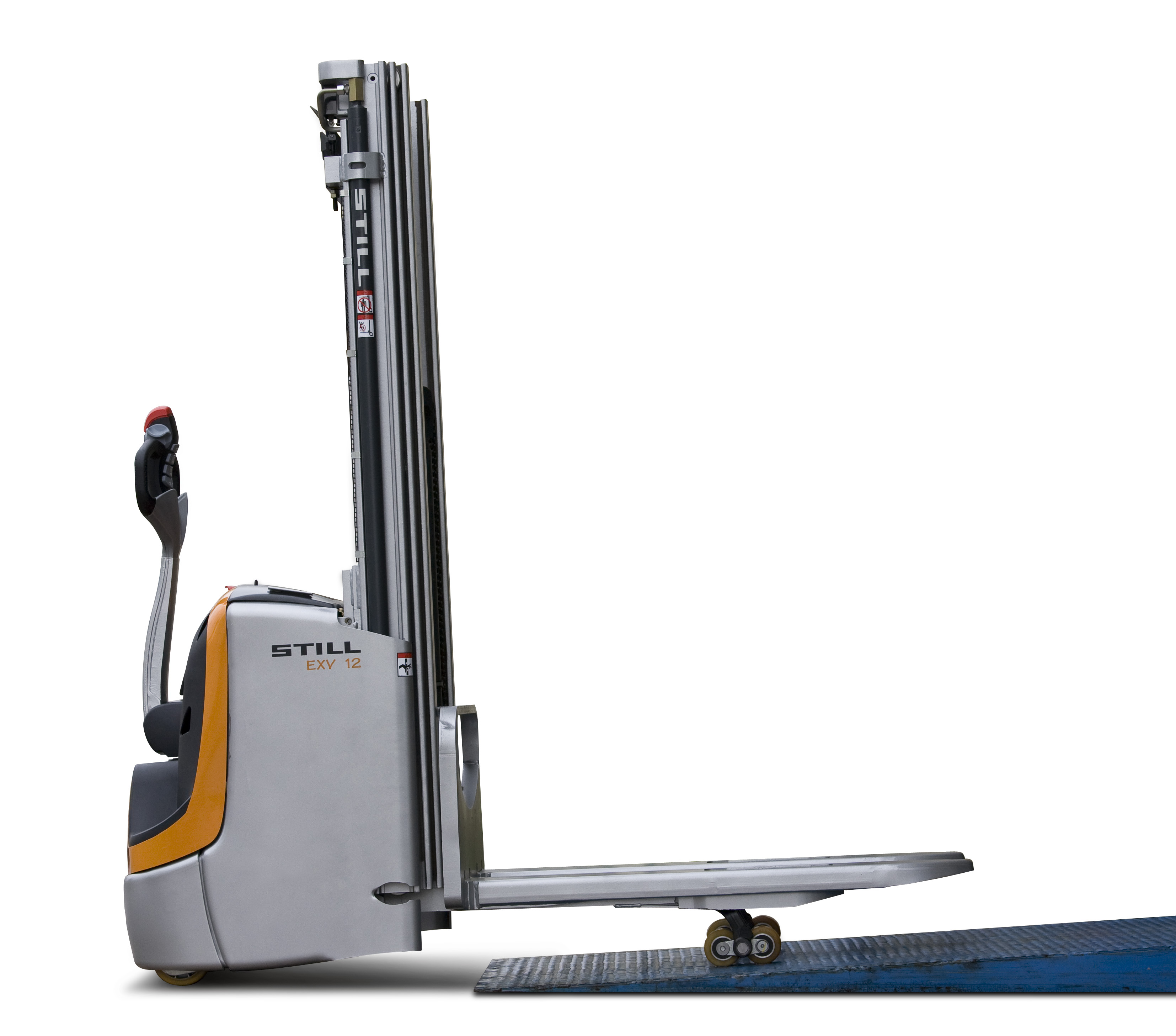 Das robuste und stabile Hubgerüst des EXV 12 i hebt die Nennlast sogar bis 2600 mm. Für die Teleskop-, NiHo- oder Dreifach-Hubgerüste stehen 10 unterschiedliche Bauhöhen zur Auswahl. Die Hydraulikzylinder sind im Mastprofil für mehr Sicherheit integriert. Der Bediener hat eine gute Sicht auf die Last. Die Resttragfähigkeiten sind hoch, die Last kann bis auf 4386 mm gehoben werden. Die Senkdämpfung bei allen Hubgerüsttypen schont das Ladegut. Die Verbindung der Gabel mit dem Gabelträger wurde verstärkt.