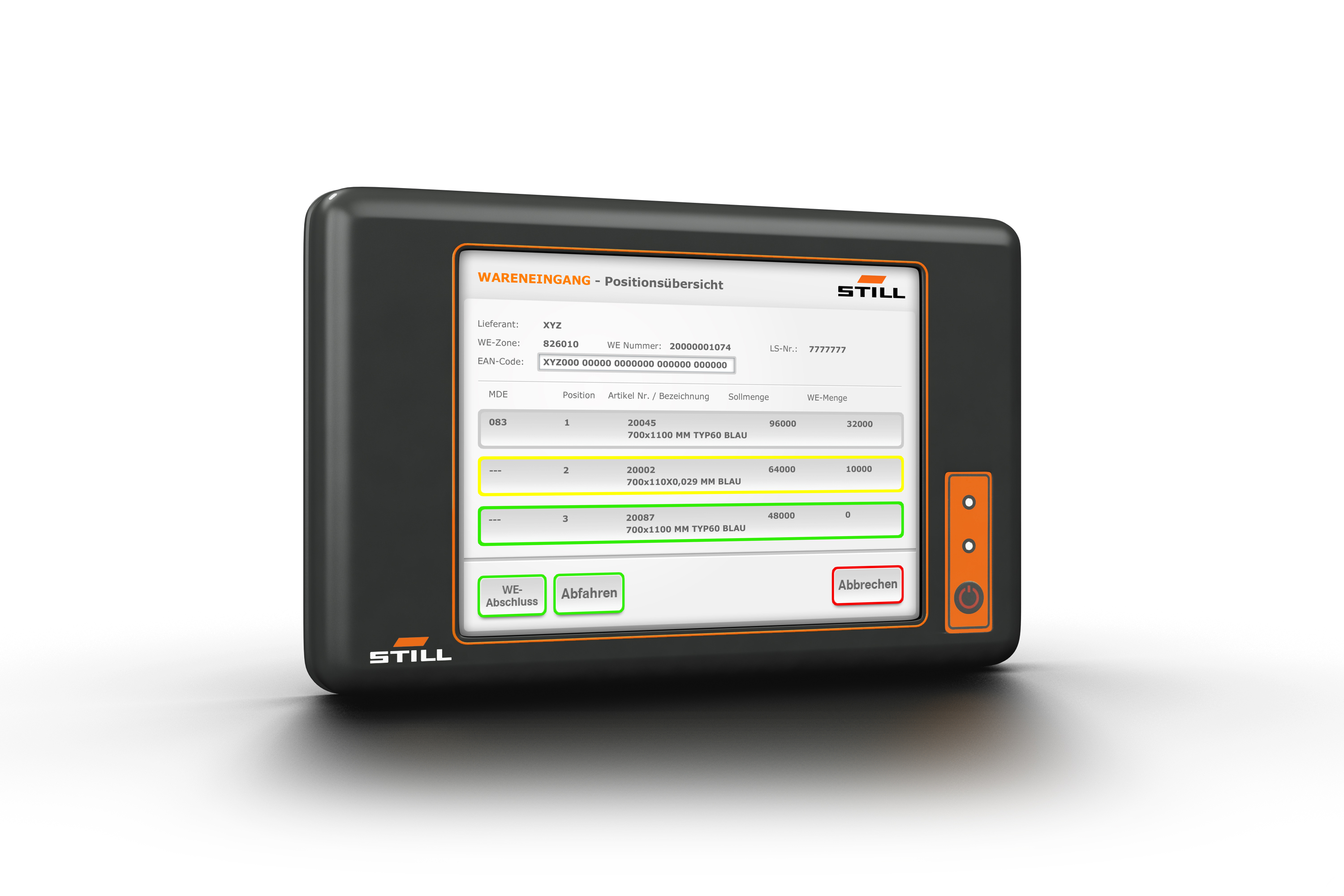 Die ideale Ergänzung zum Still MMS, sind die neuen Still Touch Terminals 8,4 Zoll und 12,1Zoll. Sie wurden für die Extrembelastungen im rauen Industriealltag entwickelt und überzeugen durch ein großflächiges, kontrastreiches Display für die Darstellung komplexer Datenmengen, z.B. für das Kommissionieren komplexer Auftragsstrukturen. Darüber hinaus sorgen ein vibrationsresistenter Speicher, in das Gehäuse integrierte Antennen, und die Schutzklasse IP 65 für eine hohe Verfügbarkeit der Terminals in dem rauen Umfeld.