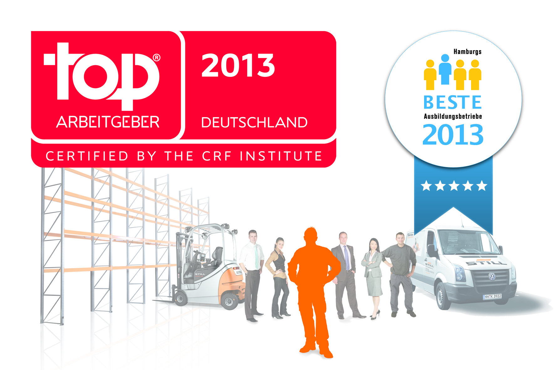 Die hohe Qualität der Ausbildung bei STILL unterstreicht auch die bestmögliche Bewertung (fünf Sterne) im Rahmen des Wettbewerbs "Hamburgs beste Ausbildungsbetriebe 2013". Da die Auszeichnung auf einer Einschätzung der Auszubildenden selbst beruht, besitzt sie für das Unternehmen einen besonderen Stellenwert. Darüber hinaus zählt STILL auch zu den Trägern des Zertifikats "Top Arbeitgeber Deutschlands". Mit dem Zertifikat zeichnet das unabhängige CRF Institute Unternehmen für eine herausragende Personalpolitik und -praxis aus.