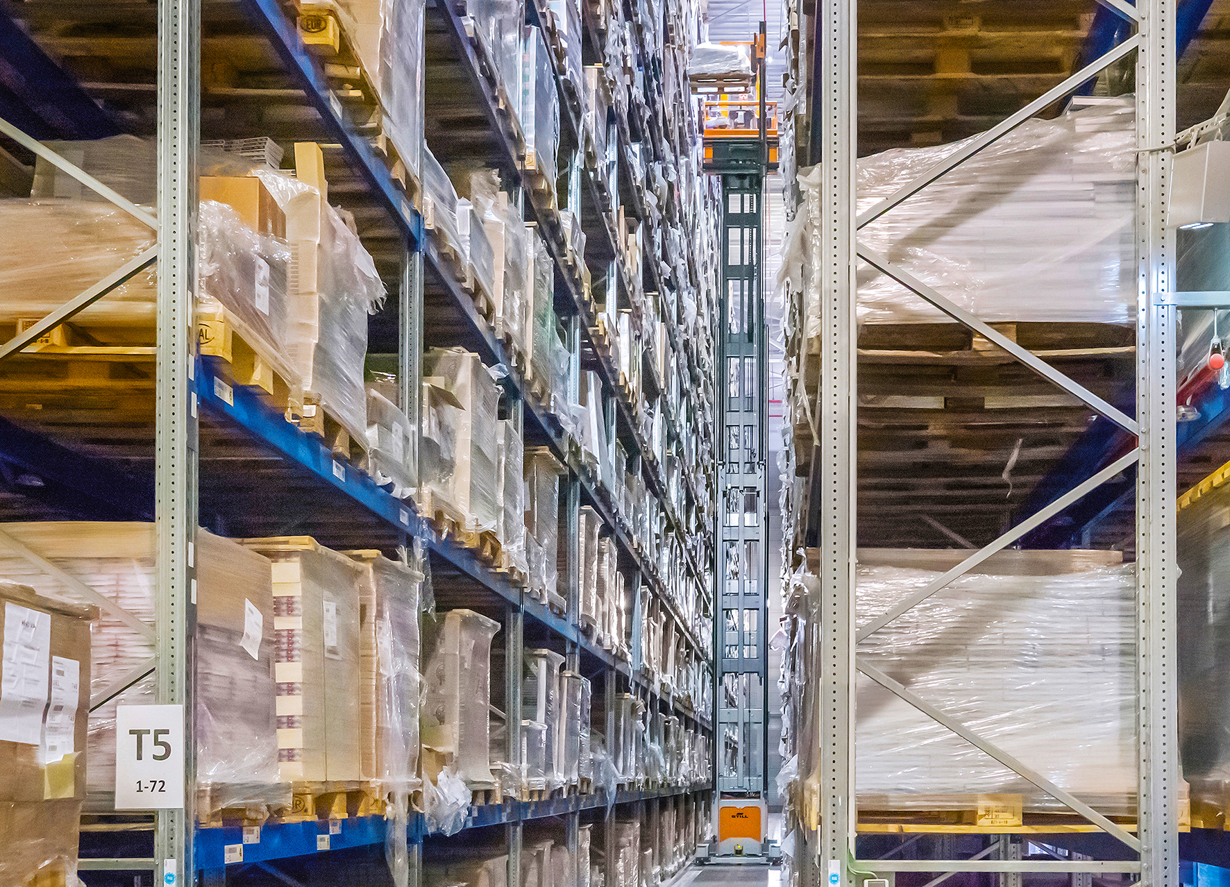Die schienengeführten MX-X Schmalgangstapler bedienen bei Schuon die oberen Regalzeilen in der Haupthalle. Mit dem Zusatzhub können die Fahrzeuge Lasten in Hubhöhen von bis zu 18 m mühelos heben. Für eine schnelle Zugriffsgeschwindigkeit werden dabei Haupt- und Zusatzhub gleichzeitig angehoben. Damit das Lasthandling nicht nur sicher vonstatten geht, sondern der Kommissioniervorgang auch beschleunigt wird, ist der MX-X mit dem neuen ALS-System ausgestattet, das die Last, ähnlich wie bei der aktiven Laststabilisierung beim STILL Schubmaststapler FM-X, stabilisiert. Das heißt, mithilfe der Hydrauliksteuerung werden die Schwingungen im Mast bei Ein- und Auslagerungen ausgeglichen. Dies ermöglicht eine intelligente Steuerung der Ausschubgeschwindigkeit und Ausschubtiefe. Es wird hierdurch neben einer gleichmäßigen Einlagerungstiefe eine um bis zu 5 % höhere Umschlagleistung beim Ein- und Auslagern erreicht.