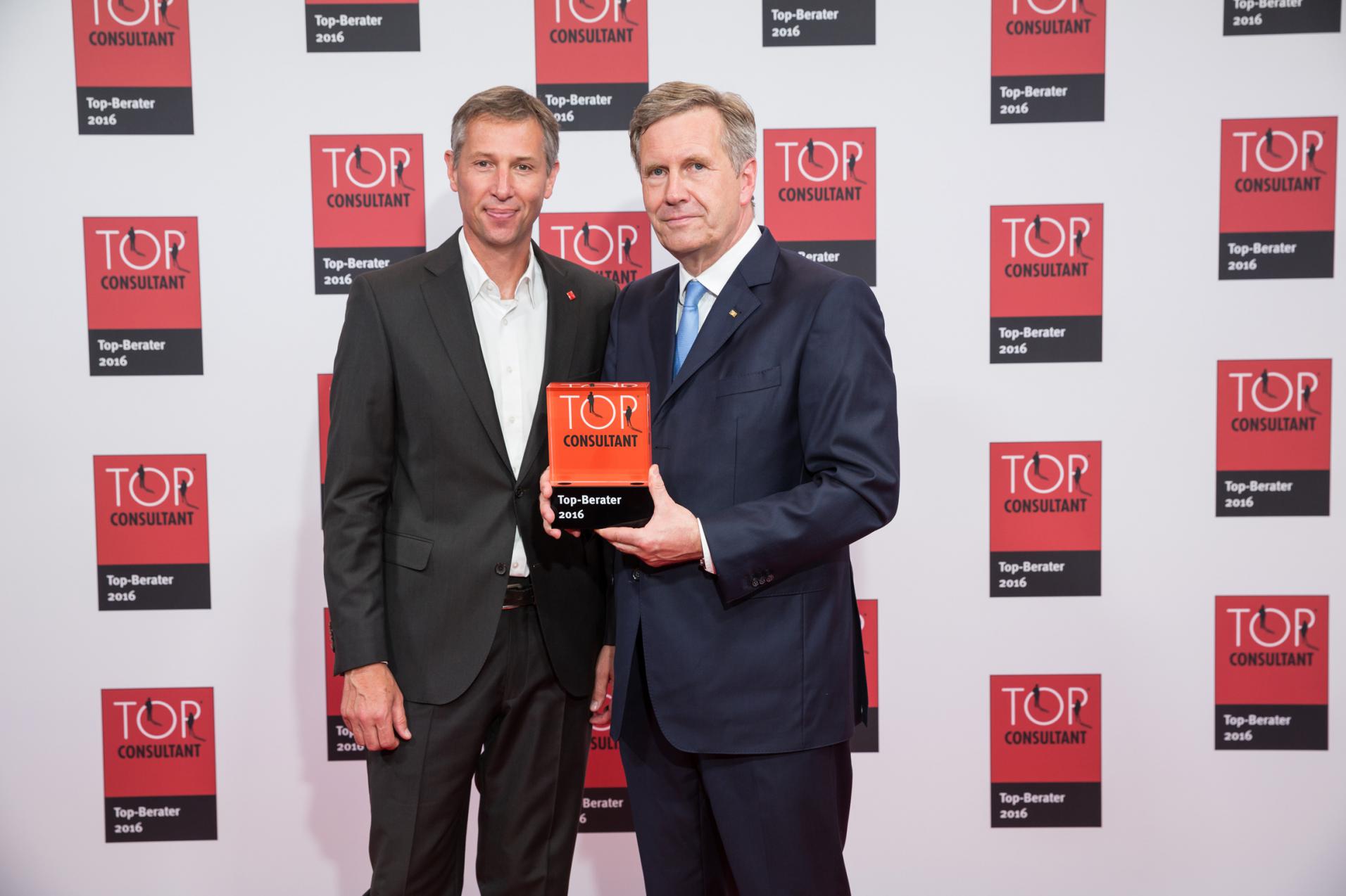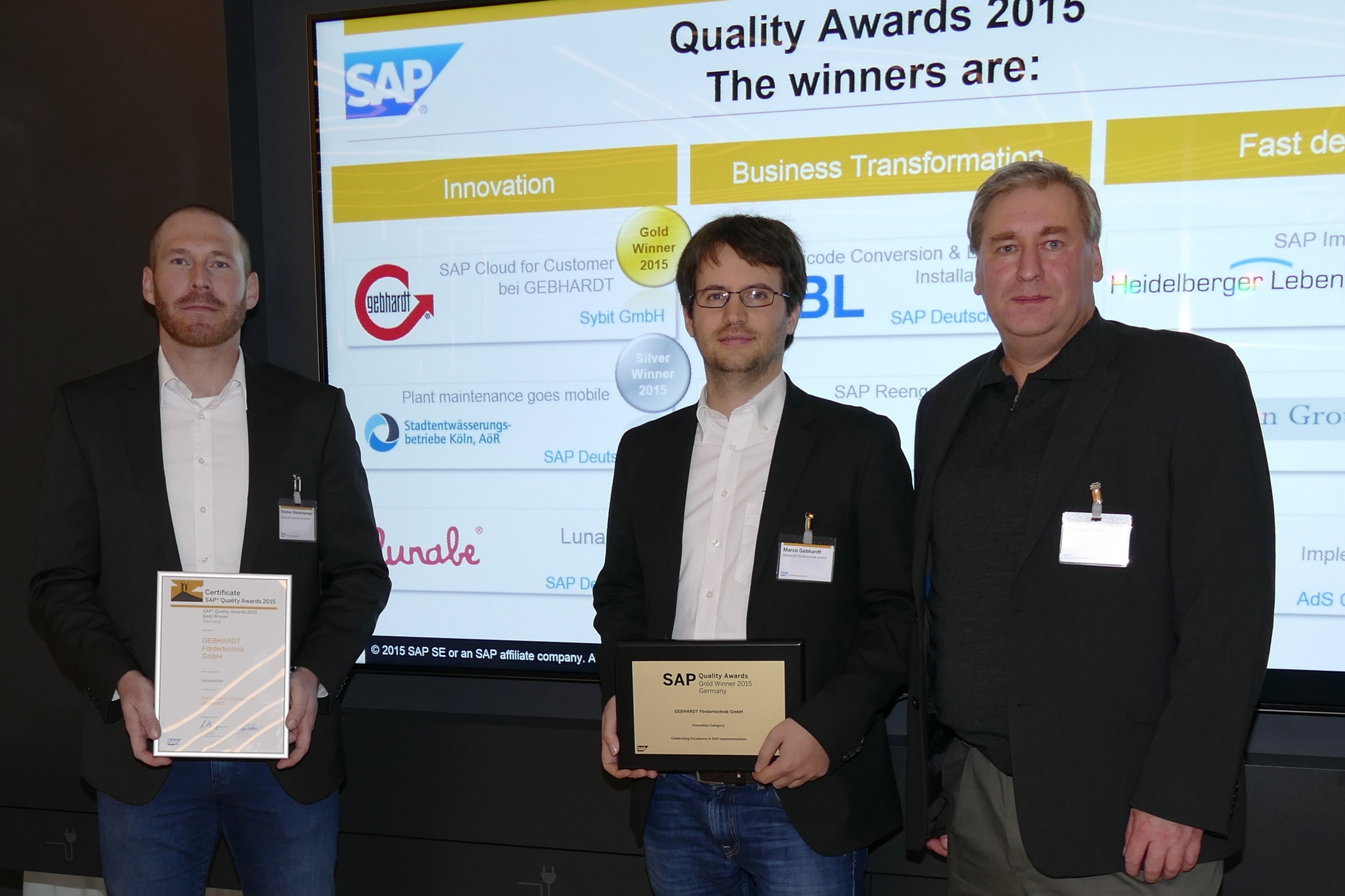Nahmen den SAP Quality Award 2015 in Gold in der Kategorie „Innovation“ entgegen: Stephan Riemensperger, Internes Projekt & SAP Management der Gebhardt Fördertechnik und Marco Gebhardt, Geschäftsführer der Gebhardt Fördertechnik, im Bild mit Thomas Kolb, Sales Director des Projektpartners Sybit (vlnr). Bild: SAP
