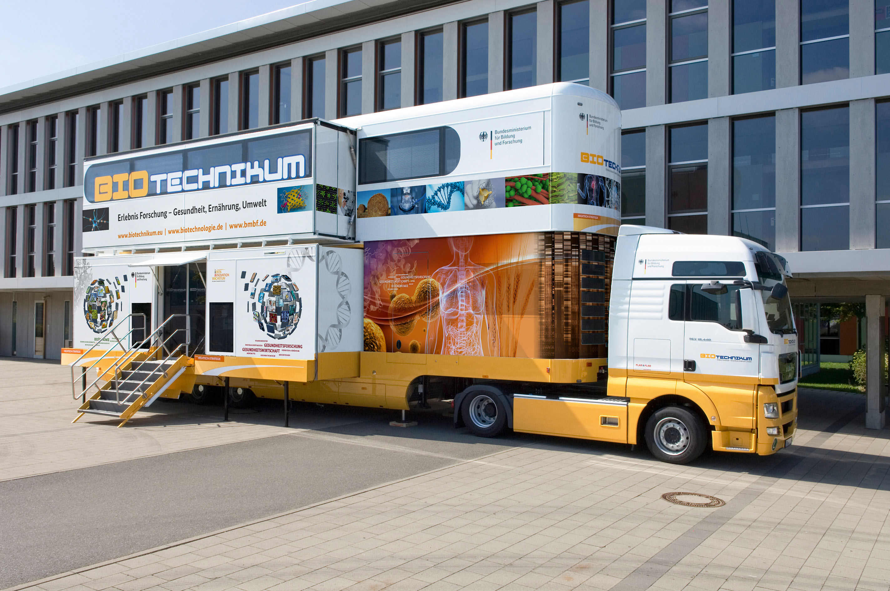 Denn dann macht das mobile Labor der Initiative "BIOTechnikum: Erlebnis Forschung - Gesundheit, Ernährung, Umwelt" des Bundesministeriums für Bildung und Forschung Station auf dem Parkplatz zwischen der Mensa und dem Fraunhofer-Institut für Digitale Medientechnologie (IDMT) in der Ehrenbergstraße. Im Inneren des auffälligen Ausstellungsfahrzeugs zeigt sich auf anschauliche Weise, wie groß die Bedeutung der Lebenswissenschaften schon heute ist, was diese in Zukunft noch leisten sollen und wo sich insbesondere für Jugendliche interessante Karrierewege auftun.