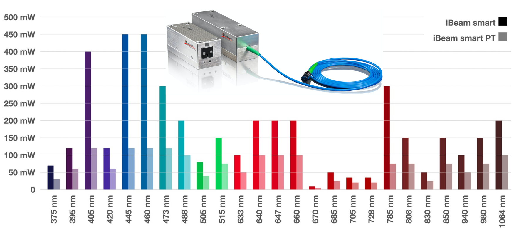 Driven by the ever-innovating photonics world, multiple requests for novel wavelengths and of course more power, TOPTICA has broadened its iBeam smart portfolio. A significant power upgrade up to 450 mW in the 405 - 460 nm wavelength range, extraordinary 200 mW at 647 nm and 660 nm, as well as more wavelength options in the near IR permits TOPTICA to serve even more industrial applications and research fields.