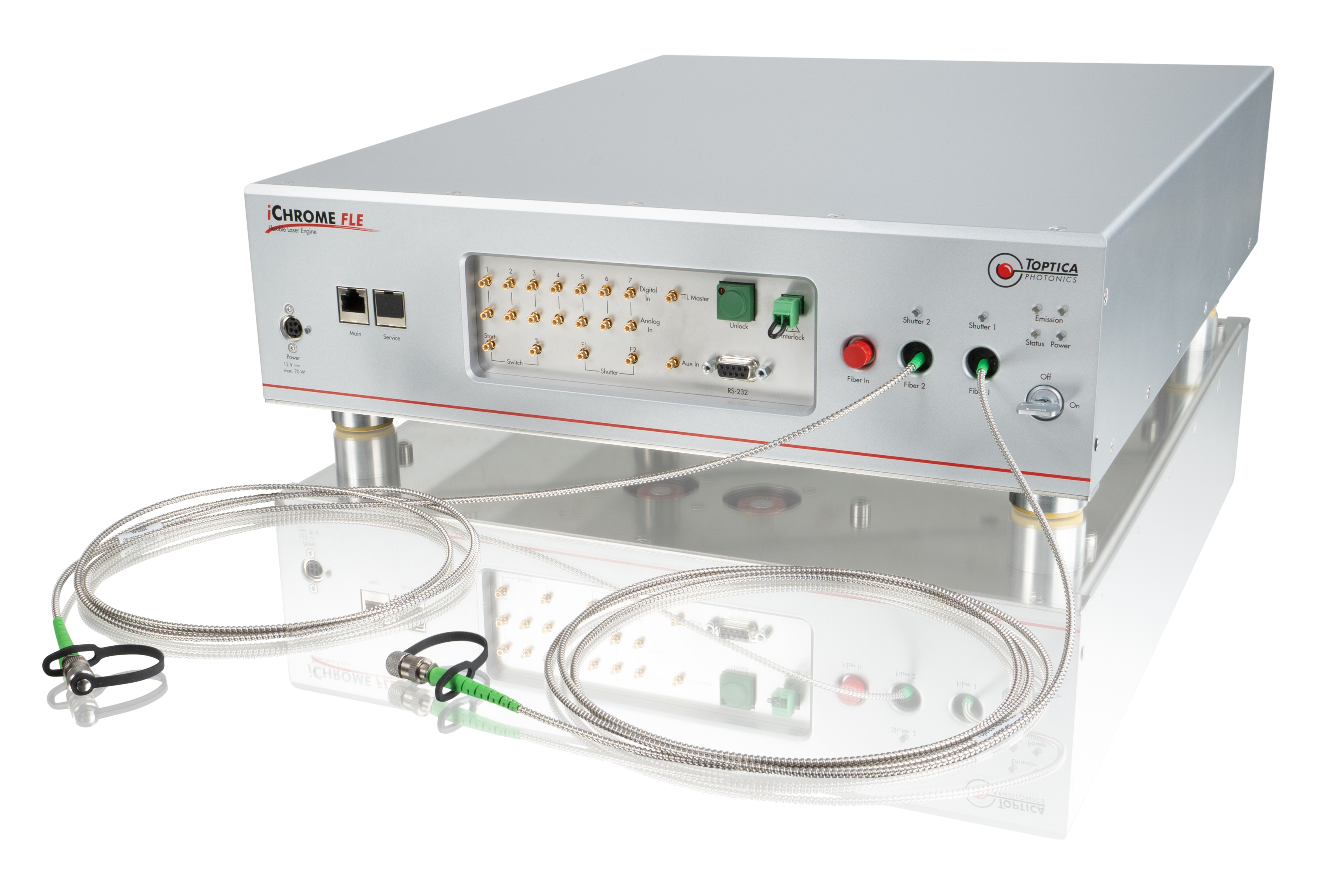 (pressebox) (Gräfelfing, 02.03.2021) The latest member of the iChrome family, the iChrome FLE, is designed as a "flexible laser engine" to serve the numerous and very diverse requirements in biophotonics. Up to 7 wavelengths (between 405 and 785nm) and two fiber outputs can be integrated into the iChrome FLE. The fiber outputs can be configured separately, so that individual wavelengths (e.g. UV or IR) can be corrected separately in the application. Alternatively, a fiber switch/splitter can be installed, allowing each wavelength to be switched separately to one of the two fibers, or to distribute the power between both fibers.
