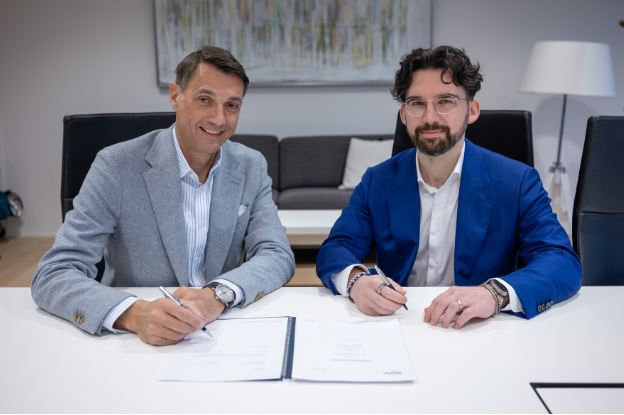Bei der Zertifikatsübergabe auf der WindEurope in Bilbao (v.l.n.r.): Martin Webhofer, TÜV SÜD, Head of Wind Energy, Stepan Mayer, TÜV SÜD, Head of Tower, Foundation and Internals, José Serna, ESTEYCO, Chief Technology Officer (CTO), Javier Nieto, ESTEYCO, Offshore Division Manager, und David Sarrasin, ESTEYCO, Product Development Director