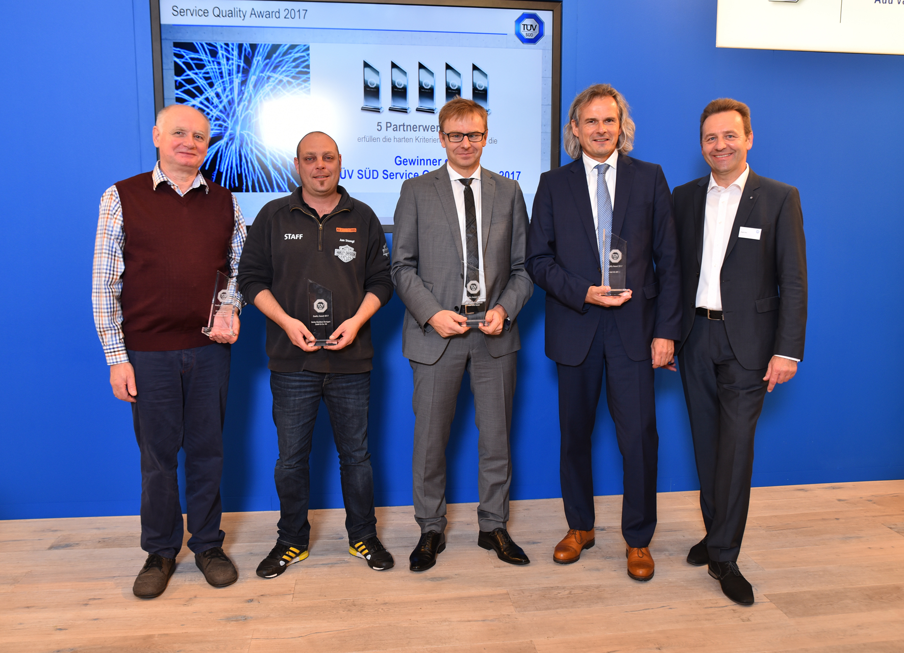 Übergabe der Urkunde auf der InnoTrans in Berlin (v.l.n.r.): Dr. Tobias Ständer, Leiter der bestimmten Stelle, TÜV SÜD Rail GmbH, Alfred Beer, Business Line Manager Rolling Stock, TÜV SÜD Rail GmbH, Dr. Andreas Thomasch, Vizepräsident Eisenbahnbundesamt, und Klaus-Michael Bosch, Geschäftsführer, TÜV SÜD Rail GmbH