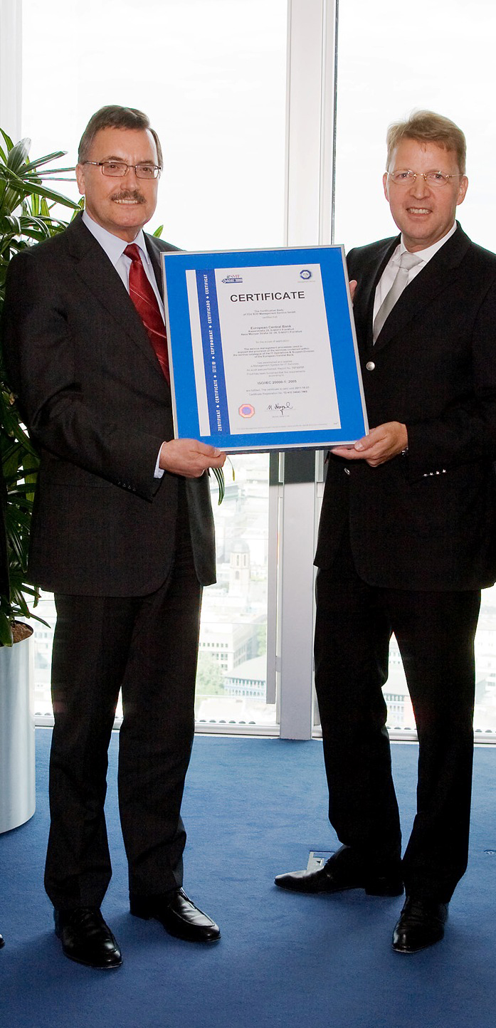 Bei der Zertifikats-Übergabe lobte Dr. Klein das detaillierte Vorgehen der EZB bei der Einführung neuer IT-Dienste und die herausragende Betriebsführung: "Gerade wenn ich die Geschäftsprozesse einer Zentralbank betrachte - sammeln, aufbereiten und kommunizieren von volkswirtschaftlichen Daten - ist dieses ohne starke IT-Unterstützung kaum mehr zu schaffen. Die Zertifizierung ist dabei keine einmalige Angelegenheit, sondern stößt einen Prozess der kontinuierlichen Verbesserung an. Damit verschafft sich die EZB einen Wettbewerbsvorteil".