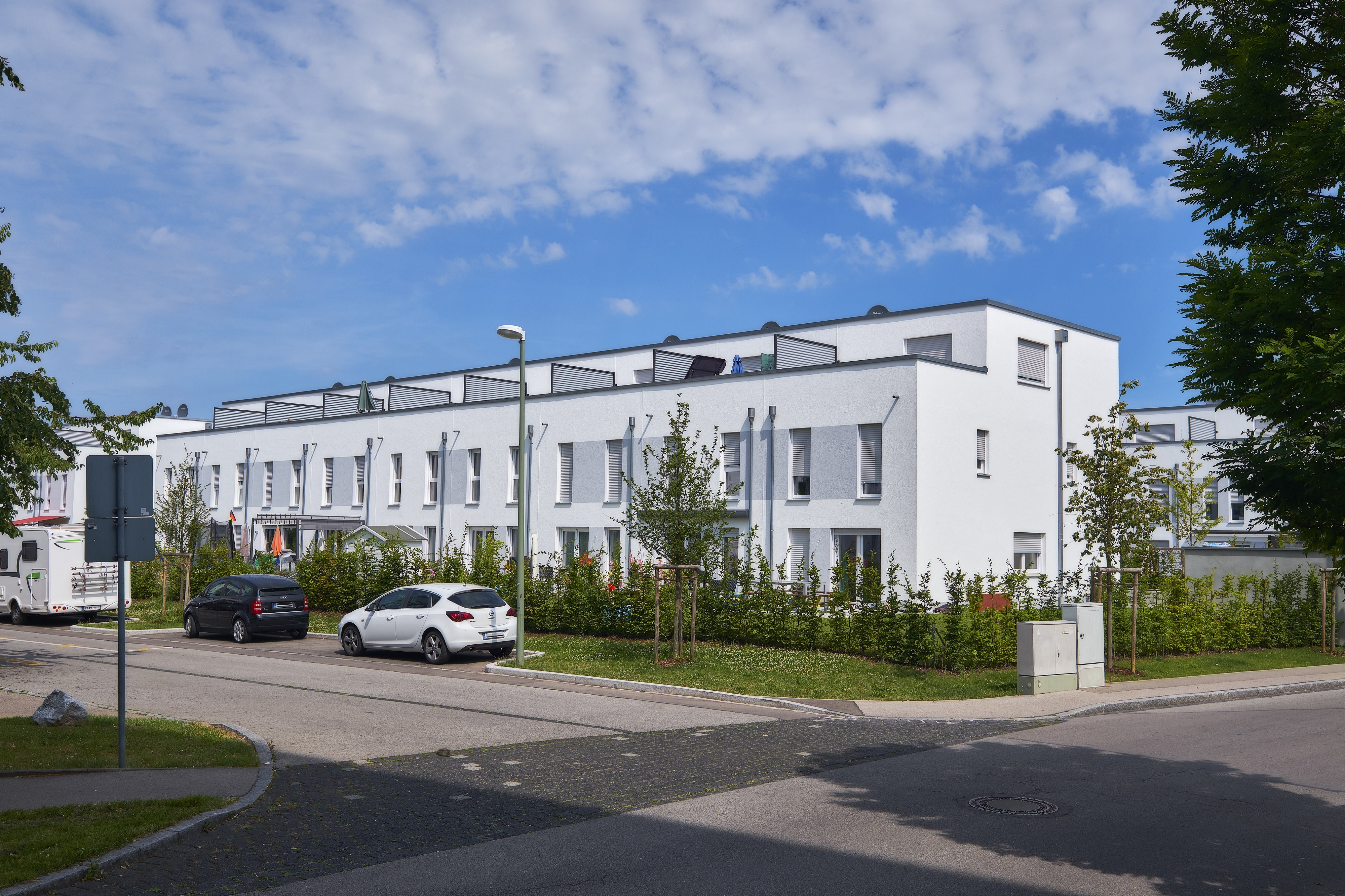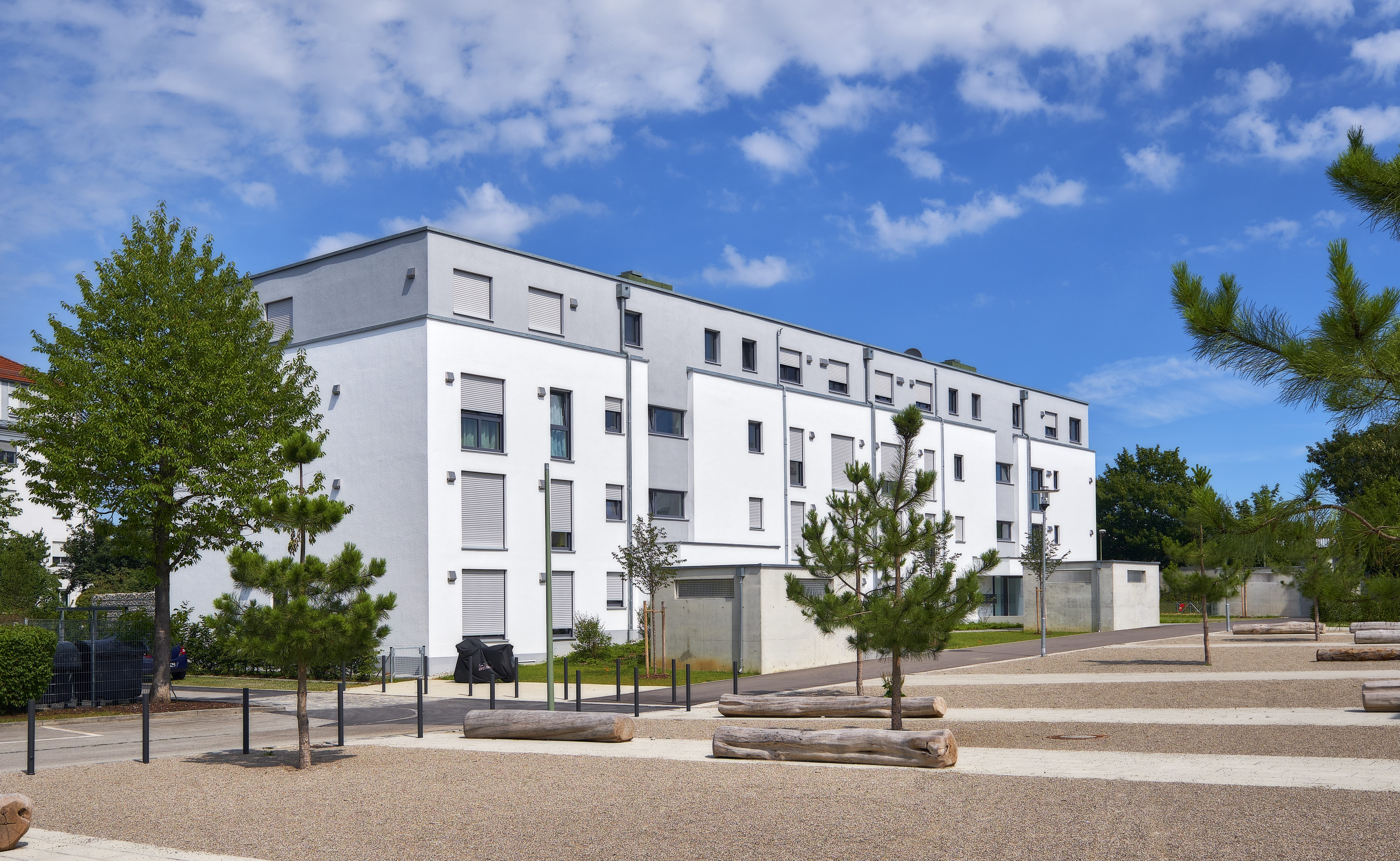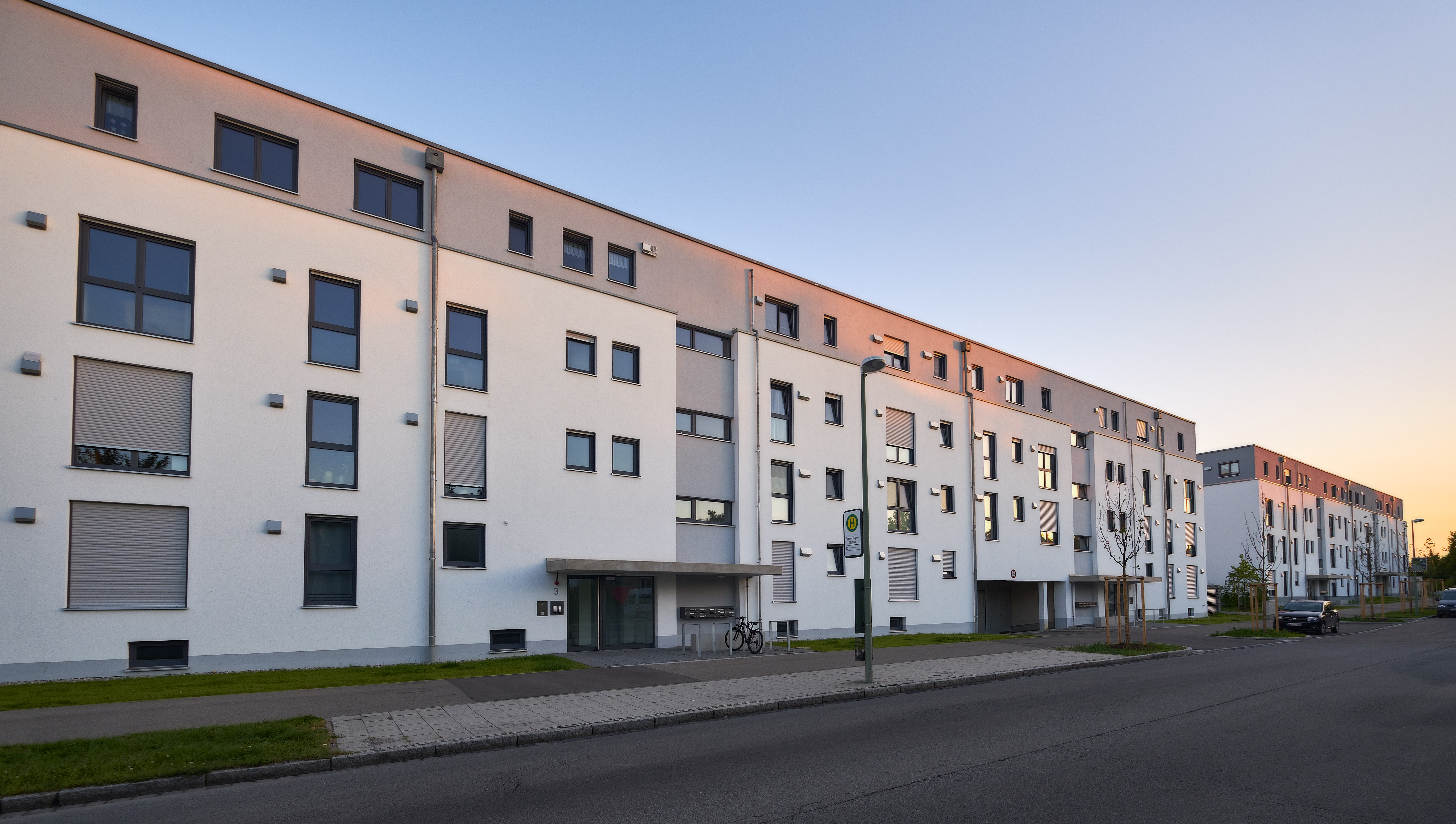 Aus diesem Grund entstanden in Augsburg in den letzten Jahren neue Wohnquartiere in beliebten Stadtteilen. Eines davon ist das „Stadtquartier Süd“ in Ausgburg-Haunstetten. In drei Bauabschnitten realisierte hier die infrabau GmbH an der Bürgermeister-Rieger-Straße 31 Stadthäuser sowie sechs Mehrfamilienhäuser mit insgesamt 68 Wohneinheiten und einer Tiefgarage mit 125 Stellplätzen. Die insgesamt sieben Baukörper bilden als Abschluss zum unmittelbar benachbarten Hallenbad und der gewachsenen Bebauung ein eigenständiges Wohnquartier. Von vier Straßen eingefasst begrenzen die Mehrfamilienhäuser den Komplex im Westen und Norden der Anlage.