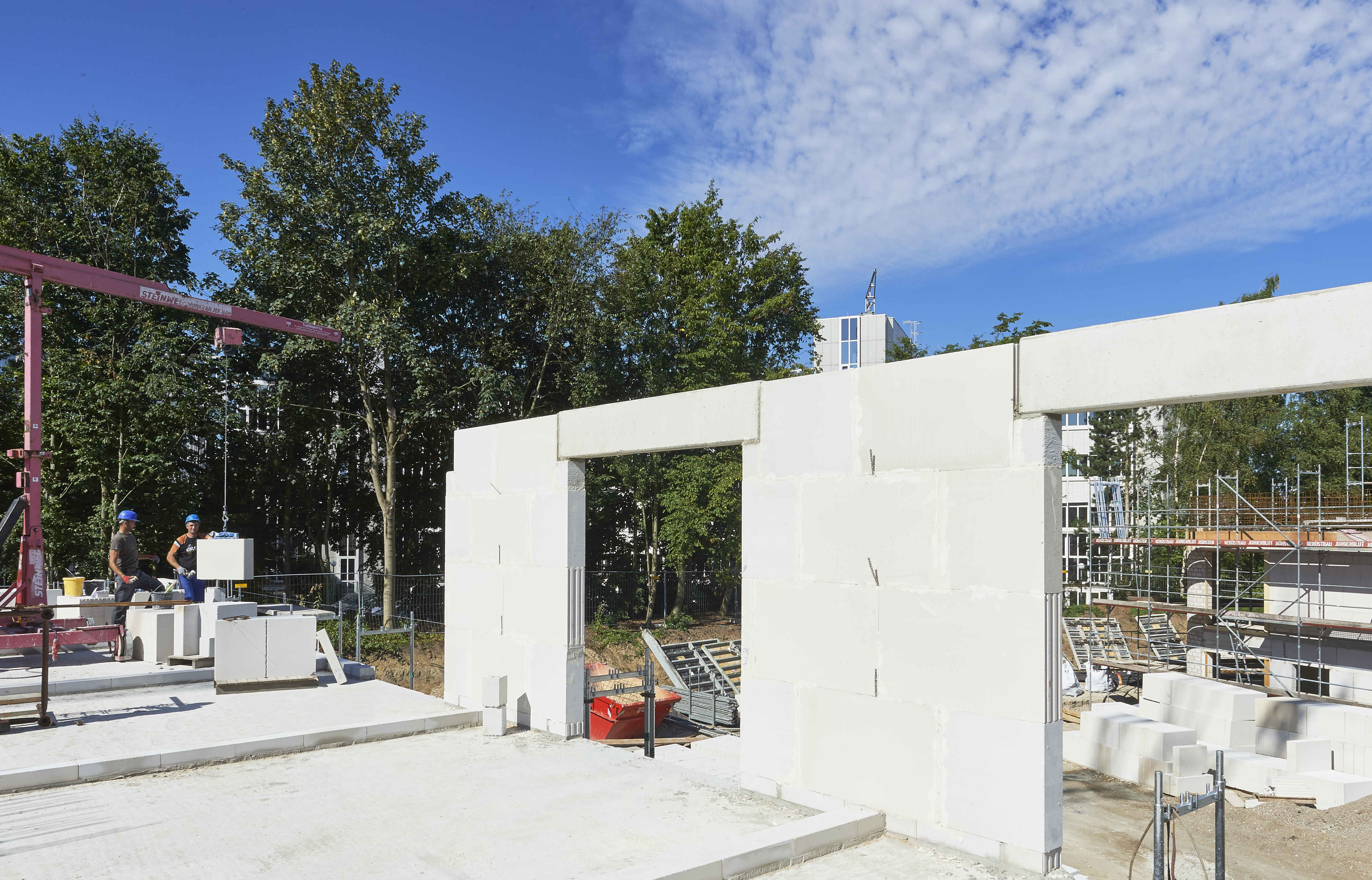 Aber nicht nur die Anzahl der Hübe, sondern auch das aufwändige Schneiden von Steinen sowie der Transport und die Entsorgung von Bauschutt und Restmaterial wird in diesem Prozess erheblich reduziert. Nach erfolgter Freigabe der vom UNIKA Werk aufbereiteten objektbezogenen Wanderstellungpläne startet die Produktion der Regelelemente sowie der maßgenauen Passstücke. Wand für Wand werden die UNIKA Planelemente für die Lieferung zusammengestellt. Deutlich beschriftet und nummeriert gelangt nur das Material an die Baustelle, das benötigt wird. Auch die endgültigen Wanderstellungspläne liegen der Lieferung bei und werden auf Wunsch auch digital bereitgestellt. Langwieriges Suchen und zeitraubendes Zuschneiden entfällt, effizientes Bauen beginnt. Bei größeren Bauvorhaben sind Änderungen selbst bis 12 Tage vor der Anlieferung an der Baustelle möglich.