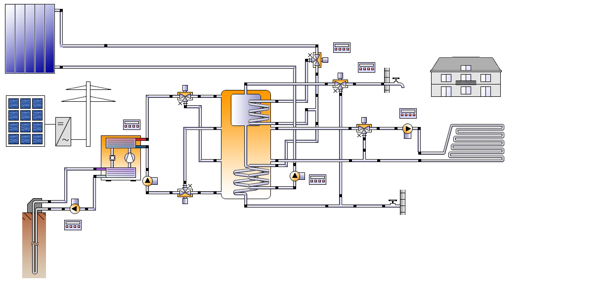 Polysun Hydraulikschema mit Solarthermie, Photovoltaik und Wärmepumpe (Erdwärme)
