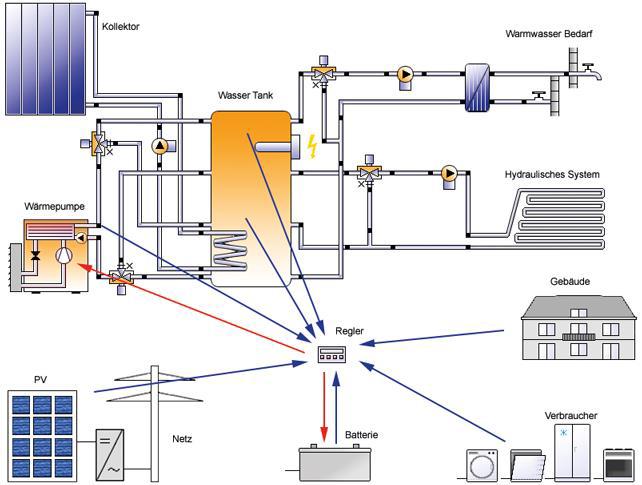 Polysun Hydraulikschema mit Solarthermie, Photovoltaik und Wärmepumpe