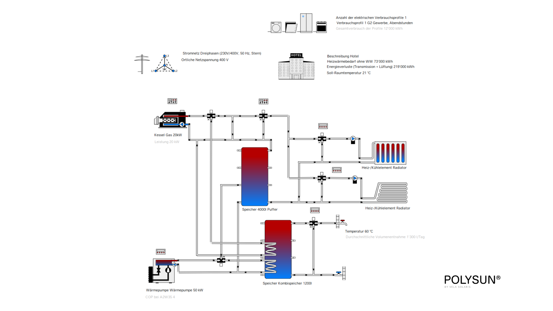 Planungsvorlage eines Hotels mit einer Pufferspeicher-Parallelschaltung