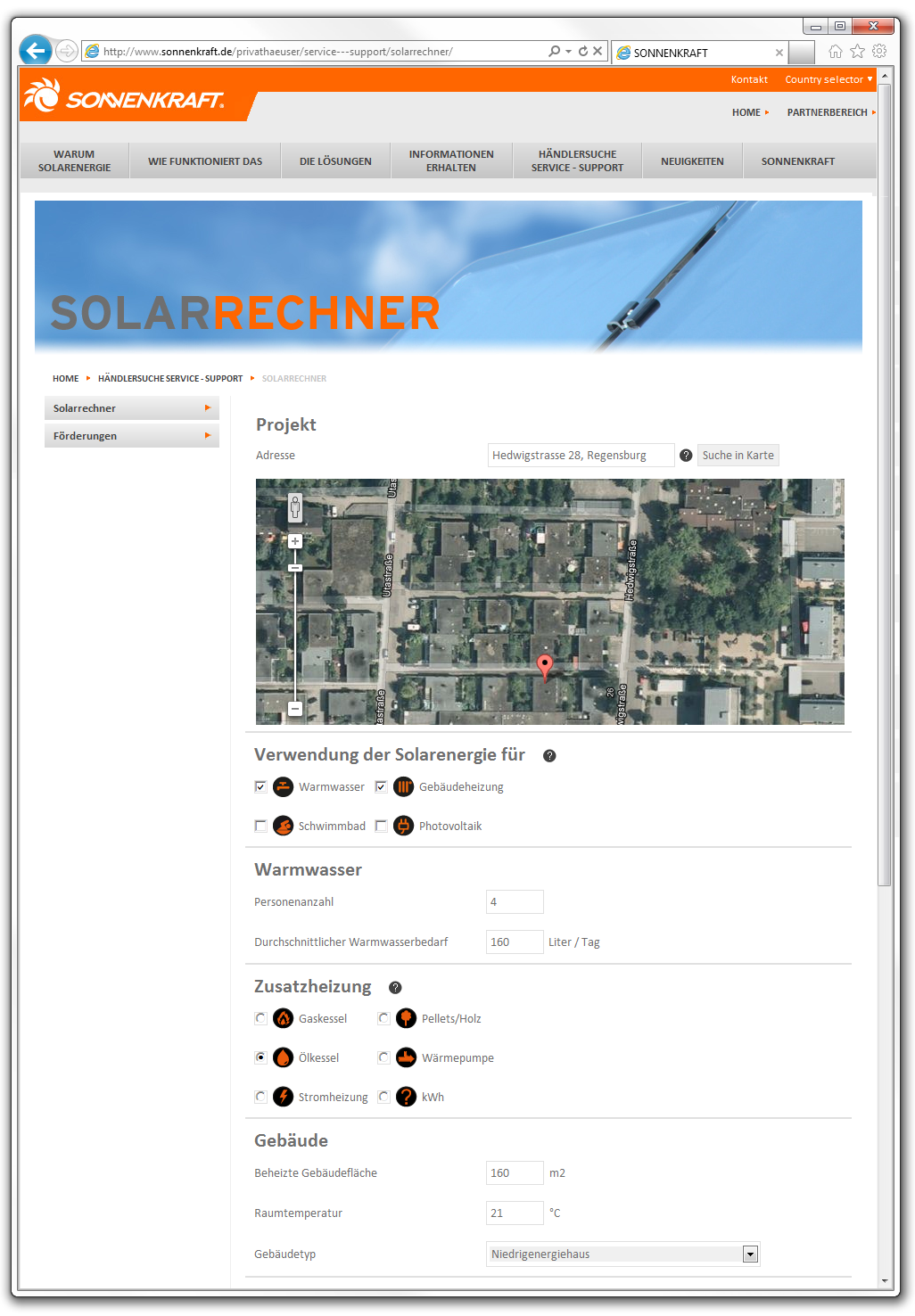 Eingabemaske des Standortes (direkt via Karte möglich), der Ausrichtung sowie der Dachneigung des Objektes