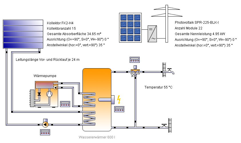 Die Polysun-Vorlagen der Ernst Schweizer AG bieten auch die Kombination von Solarthermie, Wärmepumpen und Photovoltaik in einem System an. In der Jahresbilanz wird dann erkennbar, ob der durch die Photovoltaik generierte Strom ausreicht, um die Wärmepumpe zu betreiben.