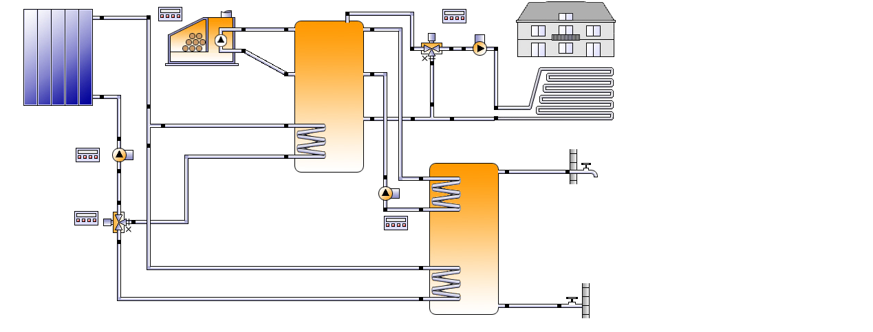 Polysun Hydraulikschema mit Solarthermie und Holzheizung