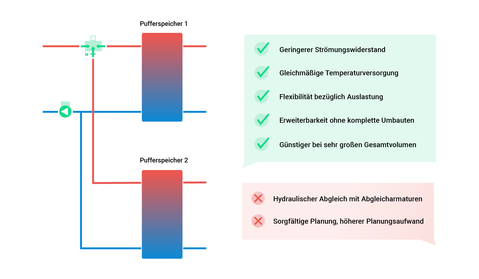 Hydraulisches Schema, Vor- und Nachteile einer Pufferspeicher Parallelschaltung