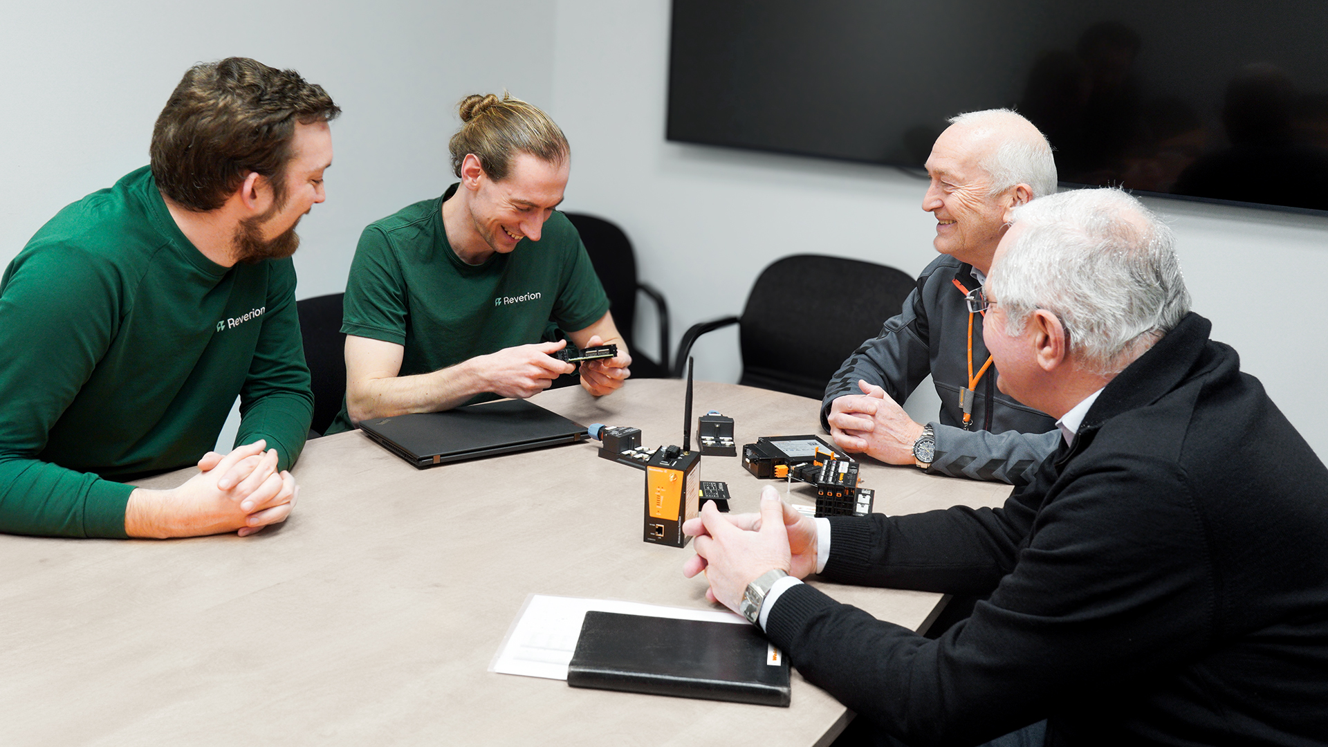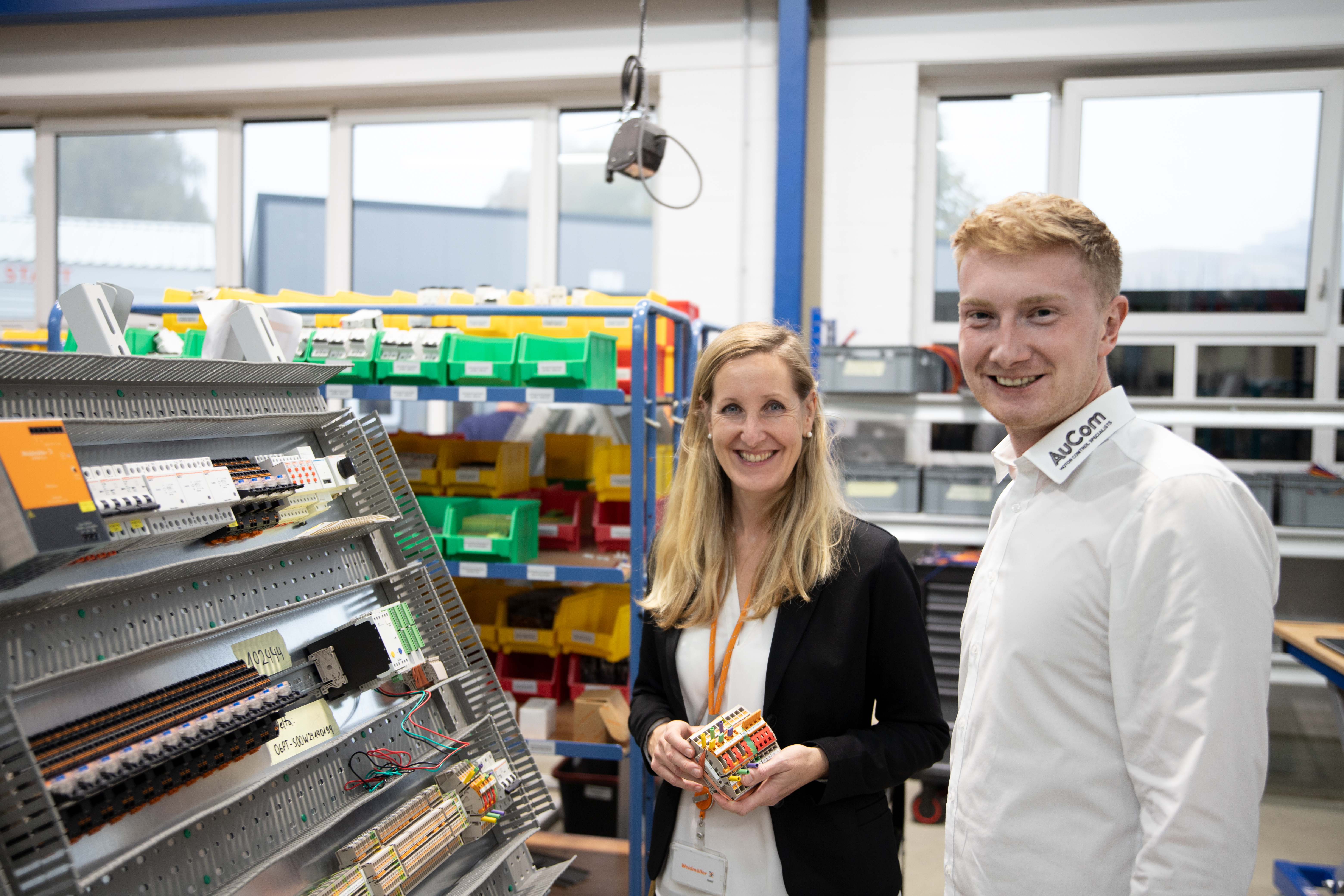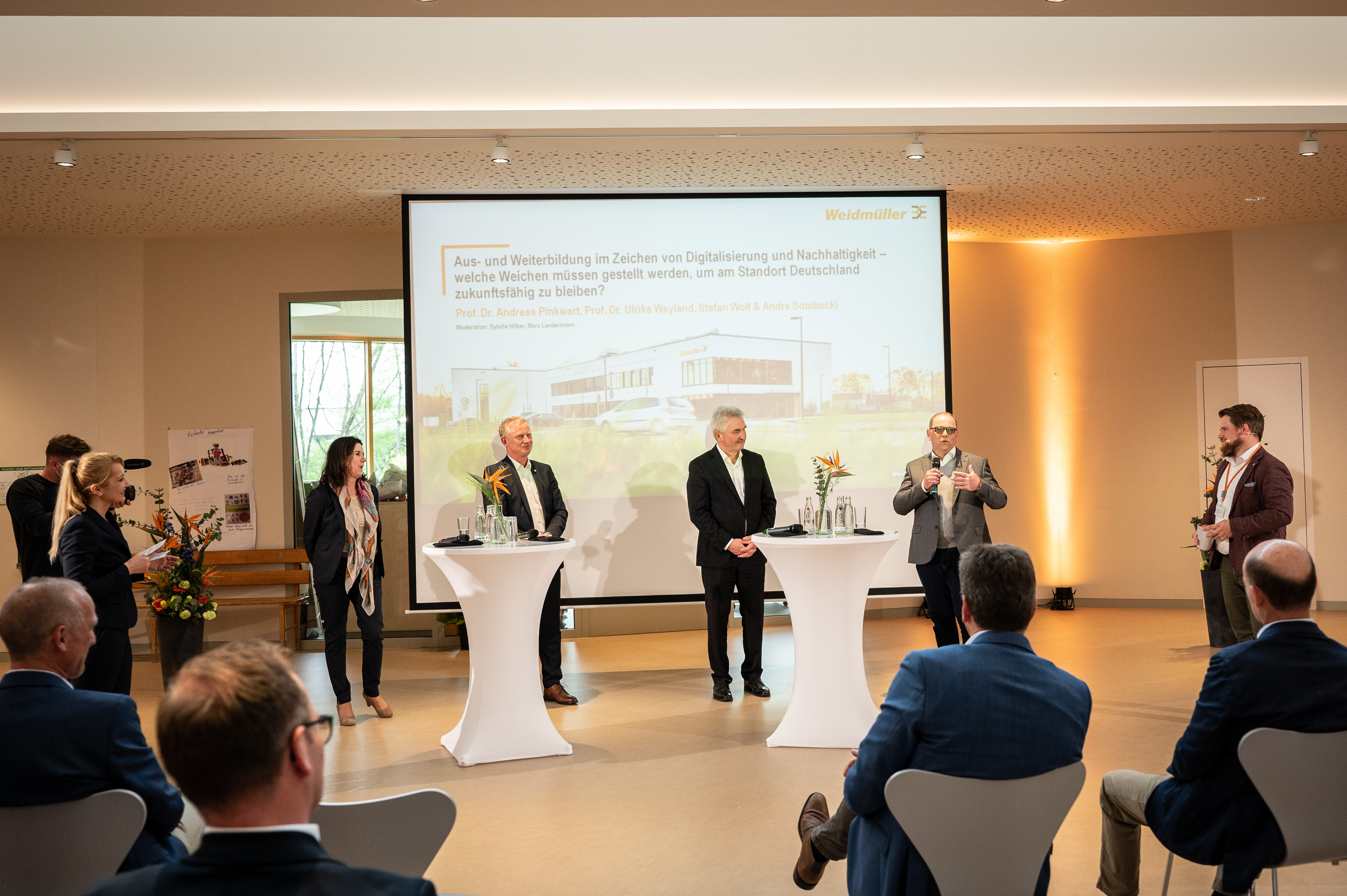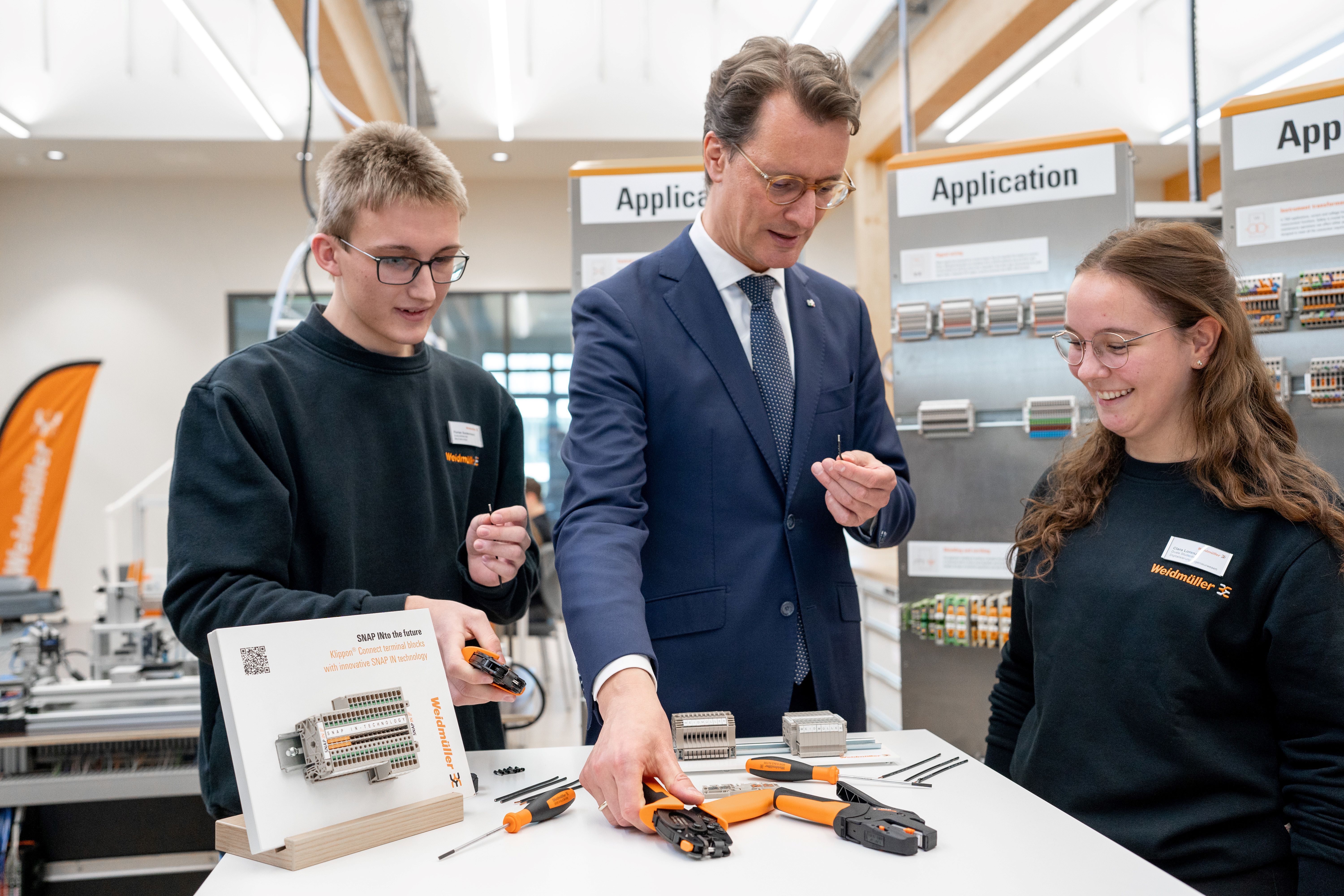 (v.l.n.r) Alexander Boschmann, Technologieentwickler bei Weidmüller, Dr. Sebastian Durst, Vorstandsvorsitzender der Weidmüller Gruppe, Mona Neubaur, Ministerin für Wirtschaft, Industrie, Klimaschutz und Energie des Landes Nordrhein-Westfalen, und Mark Edler, Leiter des Bereichs Global Environment, Health and Safety bei Weidmüller, bei der Veranstaltung zur Übergabe des Förderbescheids an die GoProZero-Projektbeteiligten
