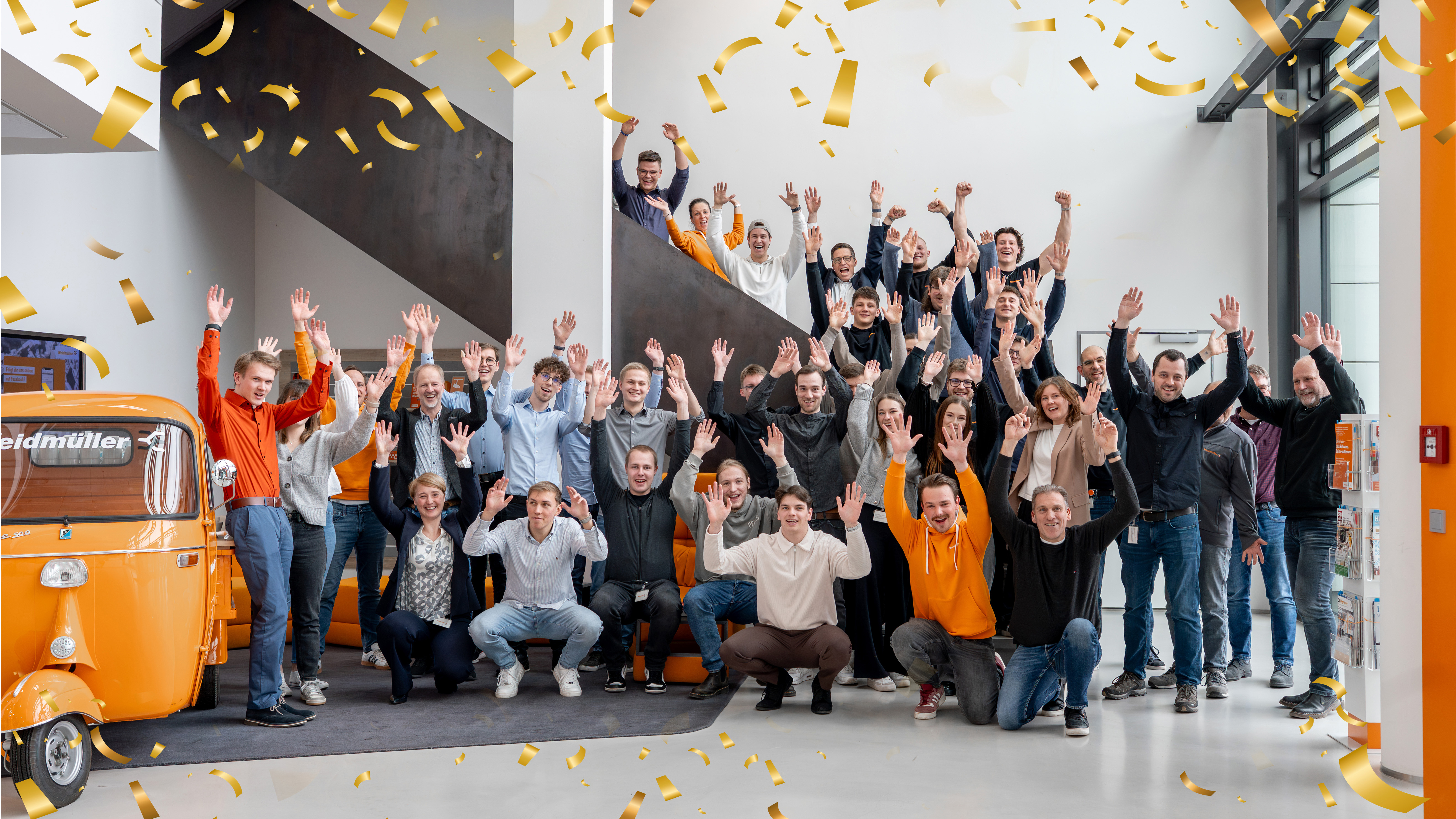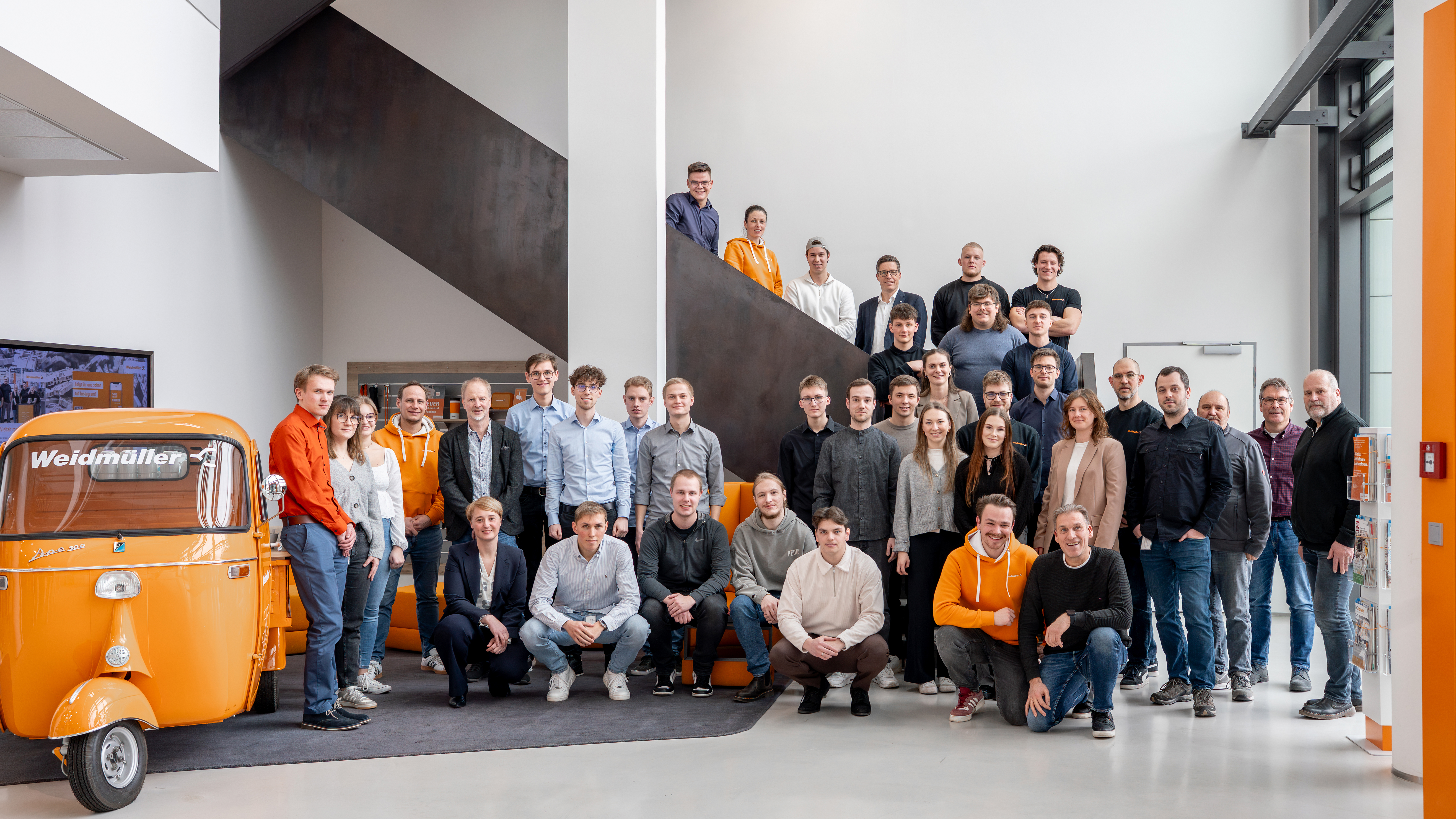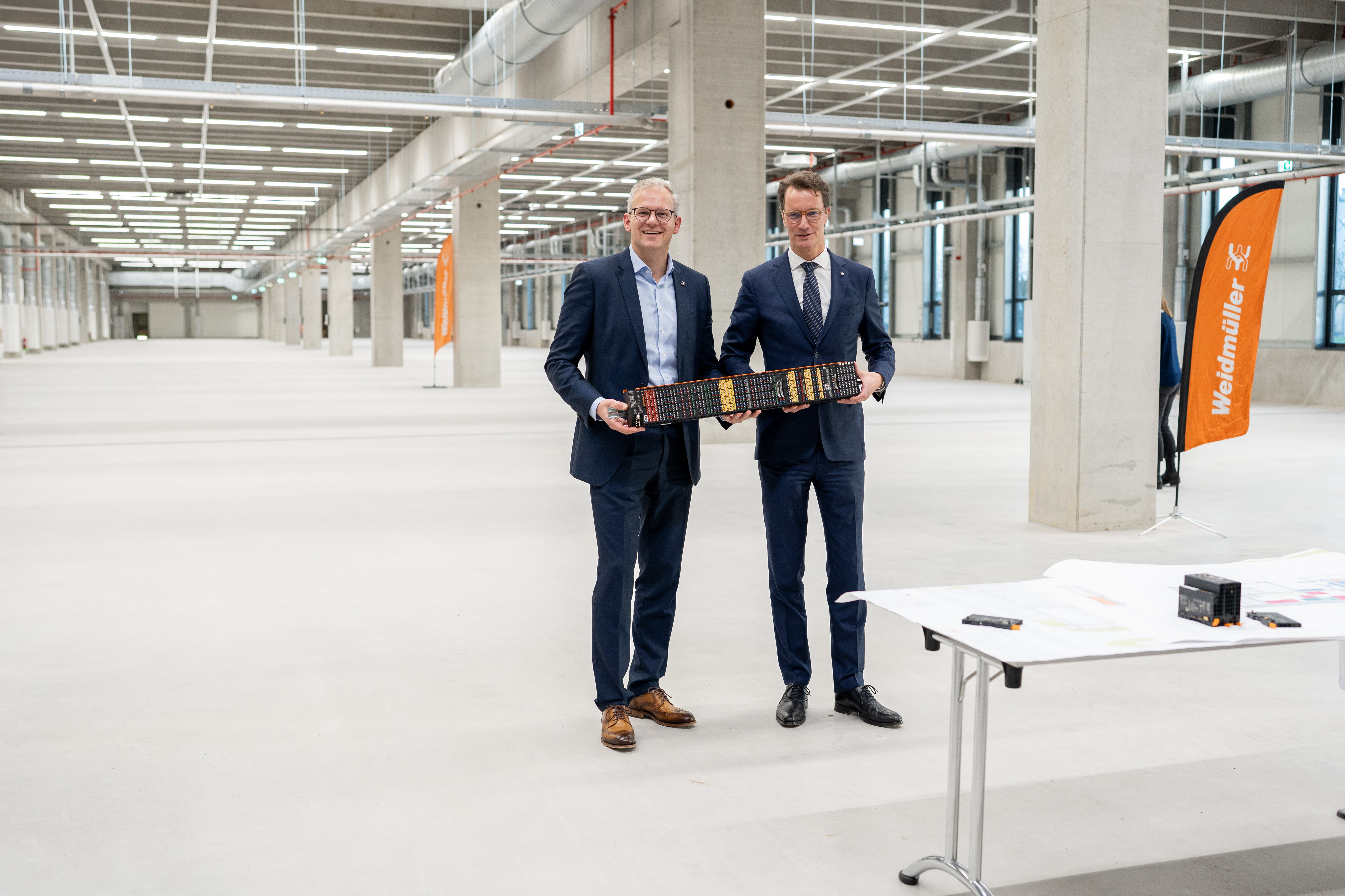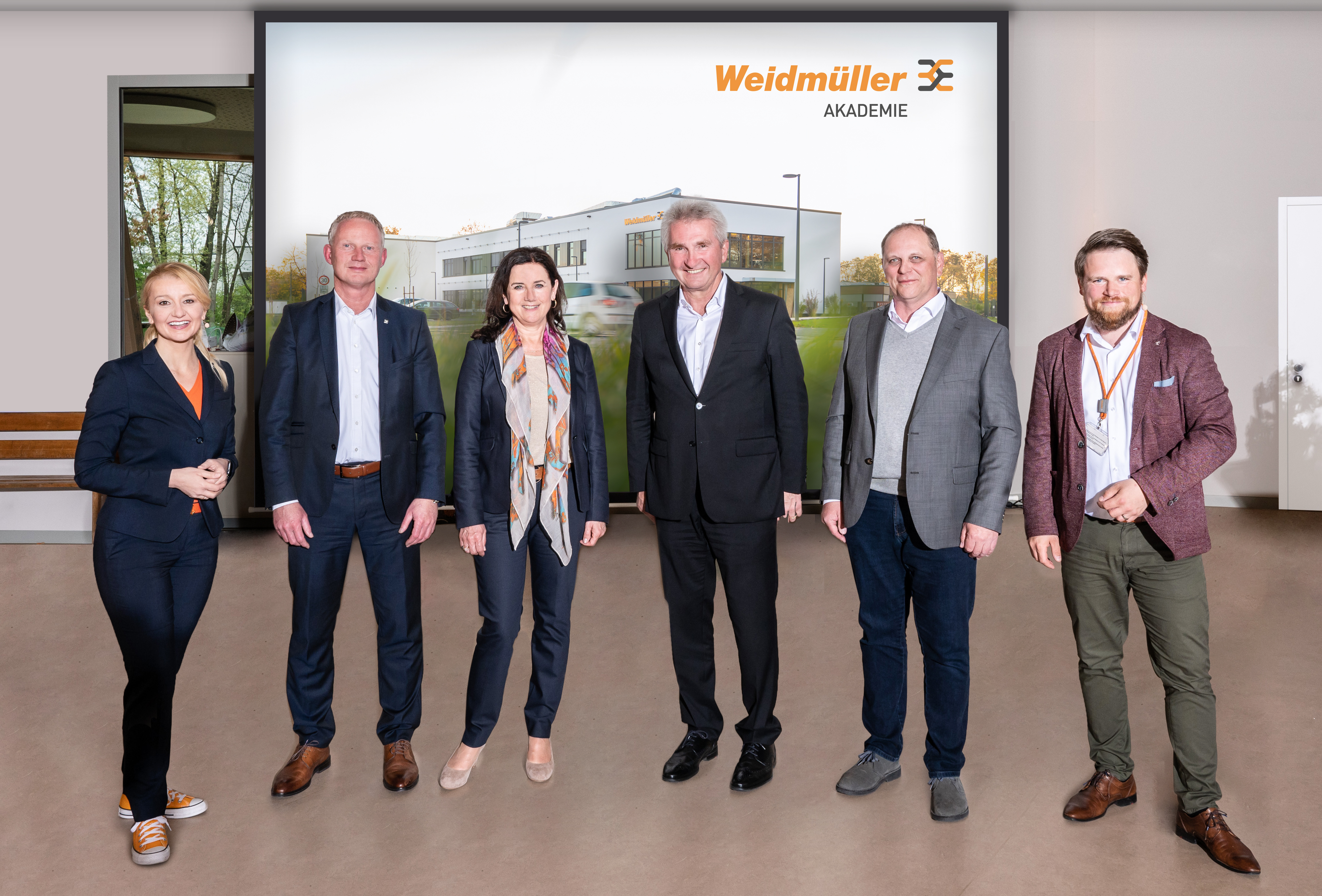 Freuen sich über die Grundsteinlegung (vorderste Reihe, v.l.n.r.): Hermann Schwagmann (Leiter Innovation and R&D Center; Weidmüller), Claus Rettkowski, Depenbrock), Helene Derksen-Riesen (Leiterin Corporate Development & Real Estate; Weidmüller), André Sombecki (Finanzvorstand; Weidmüller), Volker Bibelhausen (Technologievorstand und Vorstandssprecher; Weidmüller), Dr. Sebastian Durst (Vorstand Operations; Weidmüller), Dr. Axel Lehmann (Landrat; Kreis Lippe), Olrik Meyer (Fachbereichsleitung Umwelt, nachhaltige Entwicklung und Mobilität; Kreis Lippe), Thomas Lammering (Technischer Beigeordneter; Stadt Detmold) / Bildquelle: Weidmüller