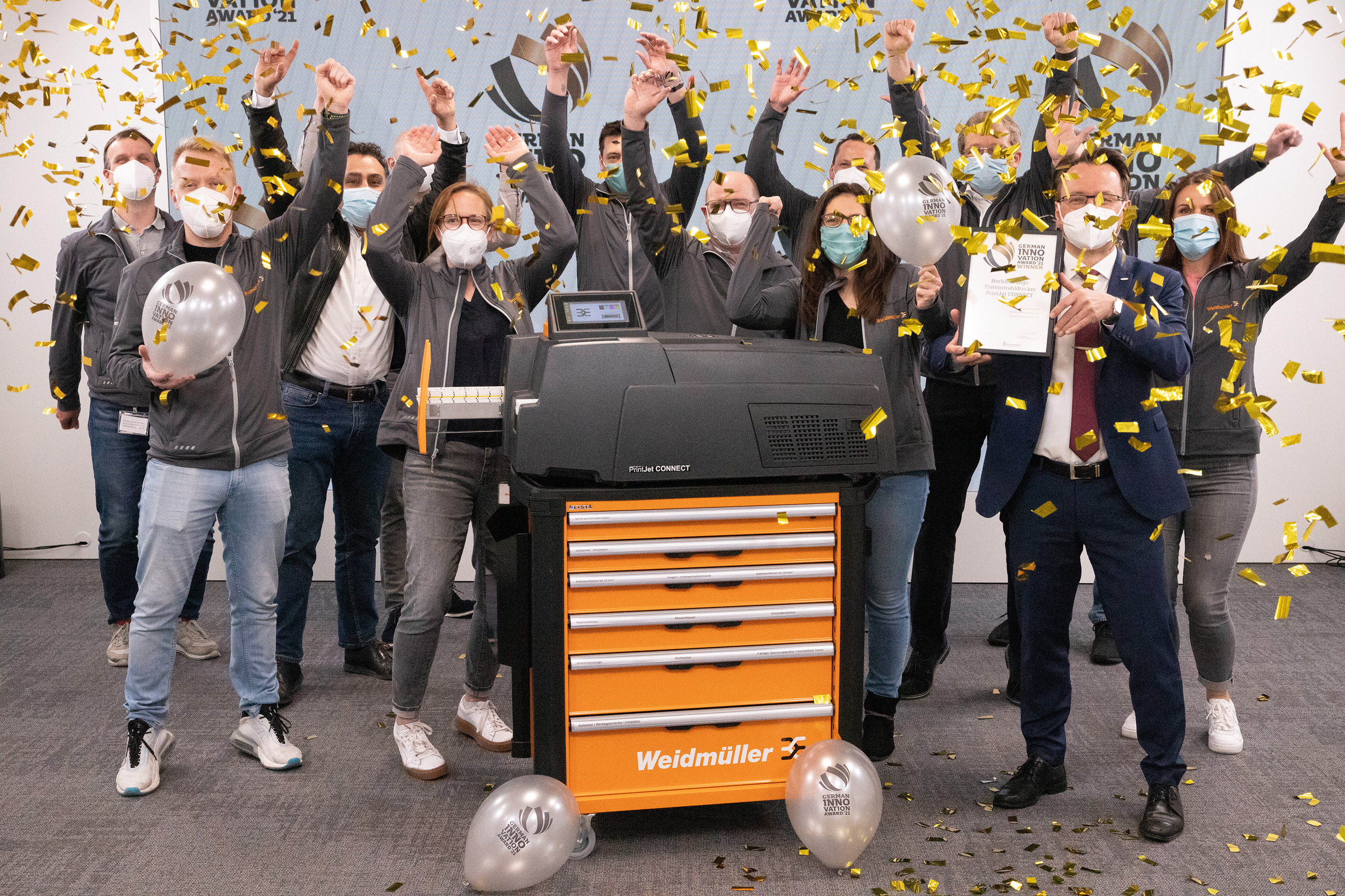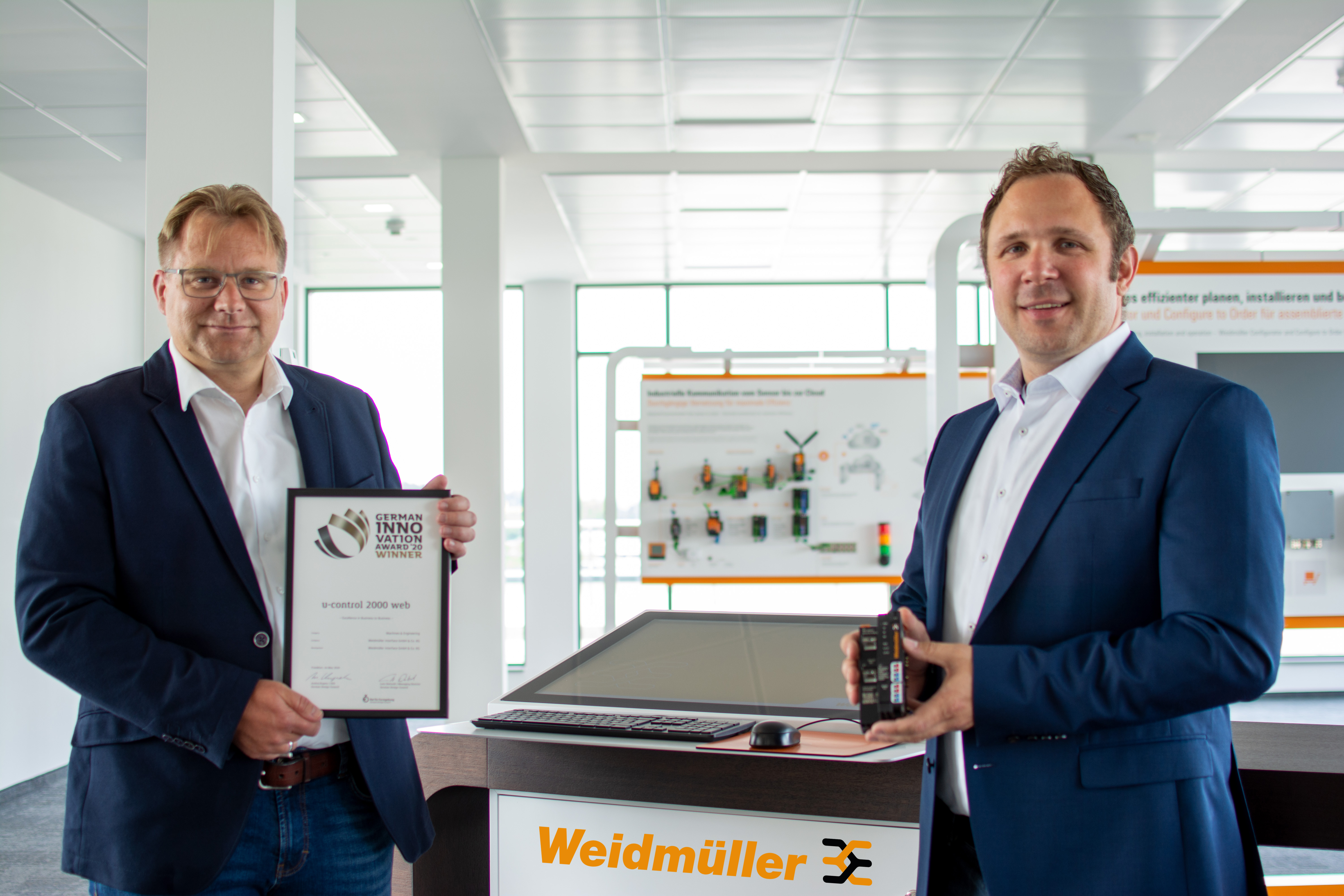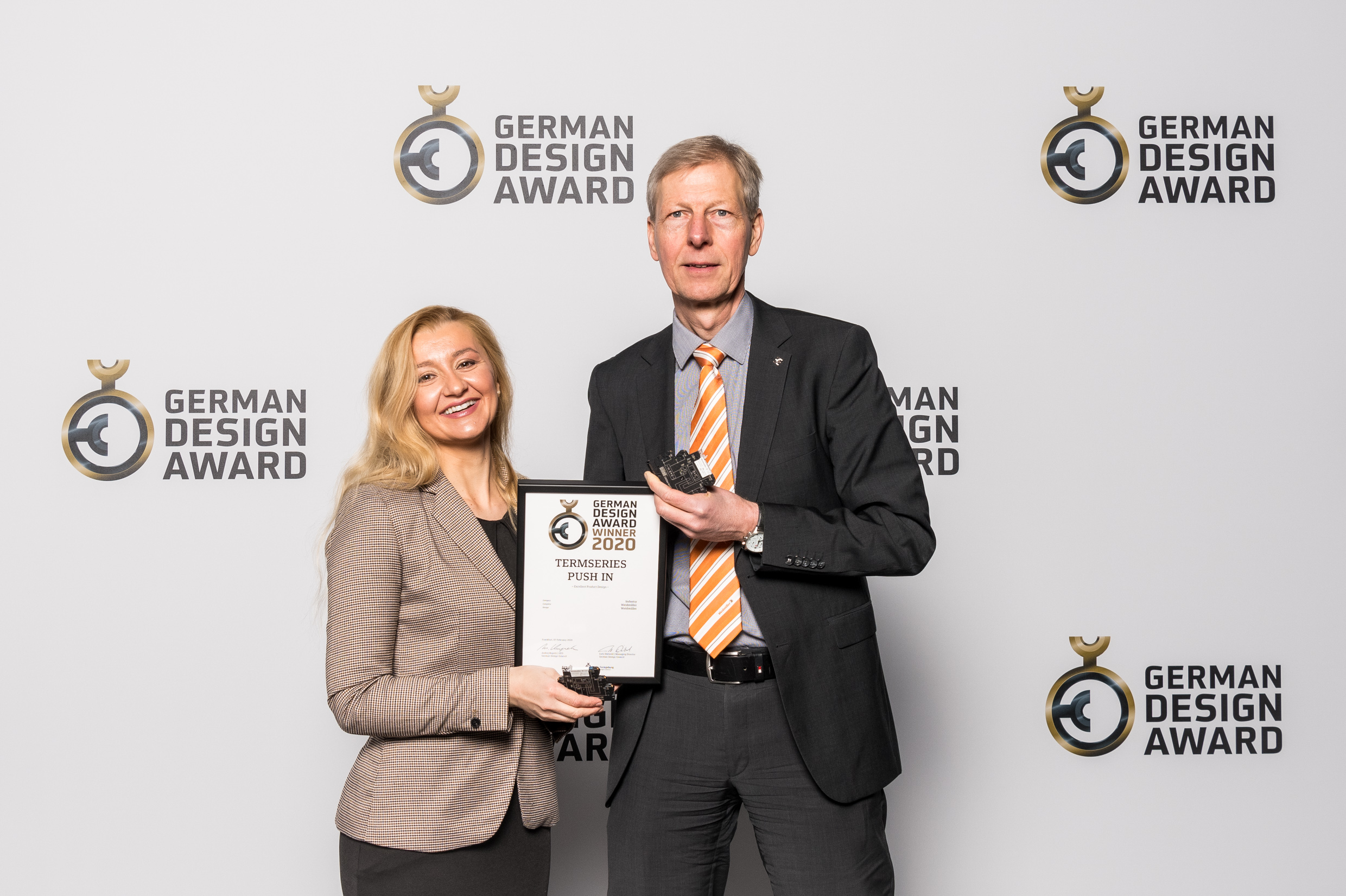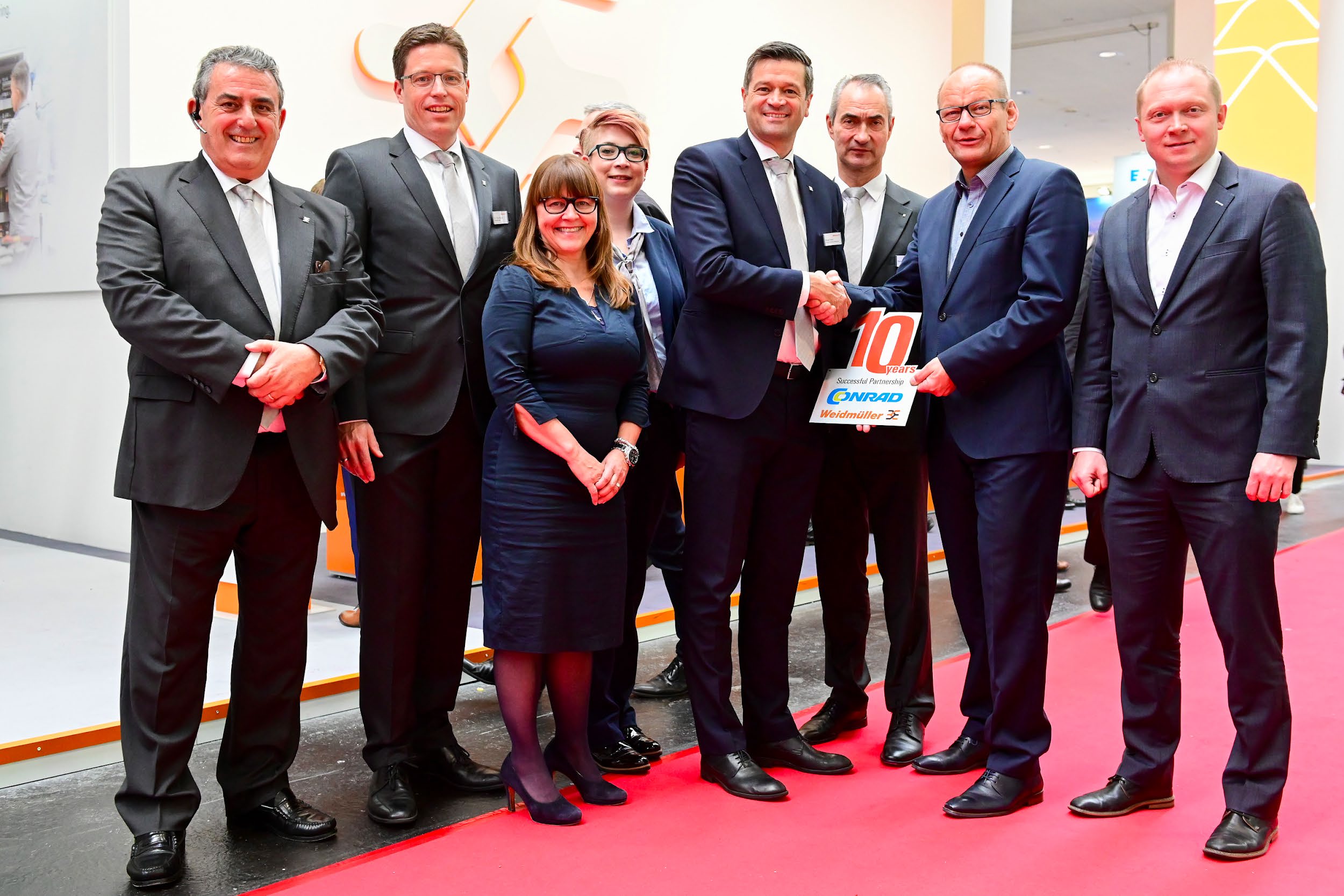 Jose Carlos Alvarez Tobar, Chief Marketing & Sales Officer; Dr. Timo Berger, Managing Director / Executive Vice President Region CE; Franziska Klein, Marketing Distribution; Roger Kroon, Vice President Global Distribution Management; Berndt van Nüss, Manager Catalogue, Online- and Tools Distributors von Weidmüller und Pirjo Niemi, VP Strategic Marketing, B2B Europe, Andreas Lippert, Vice President, B2B DACH; Michael Schlagenhaufer von Conrad Electronic bei der Übergabe des Awards