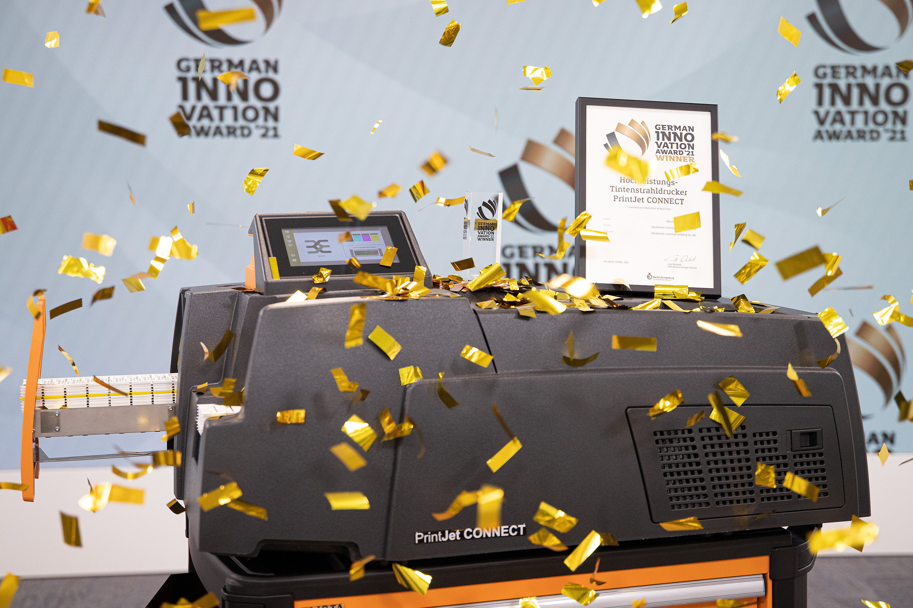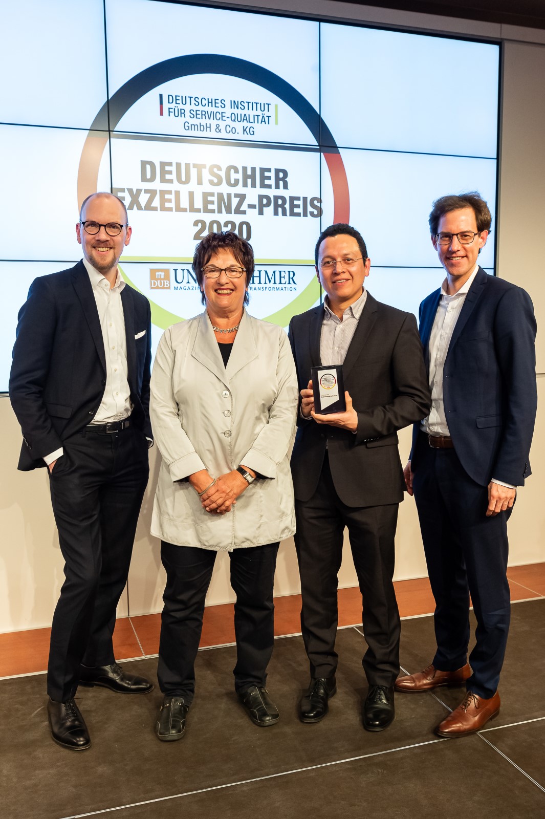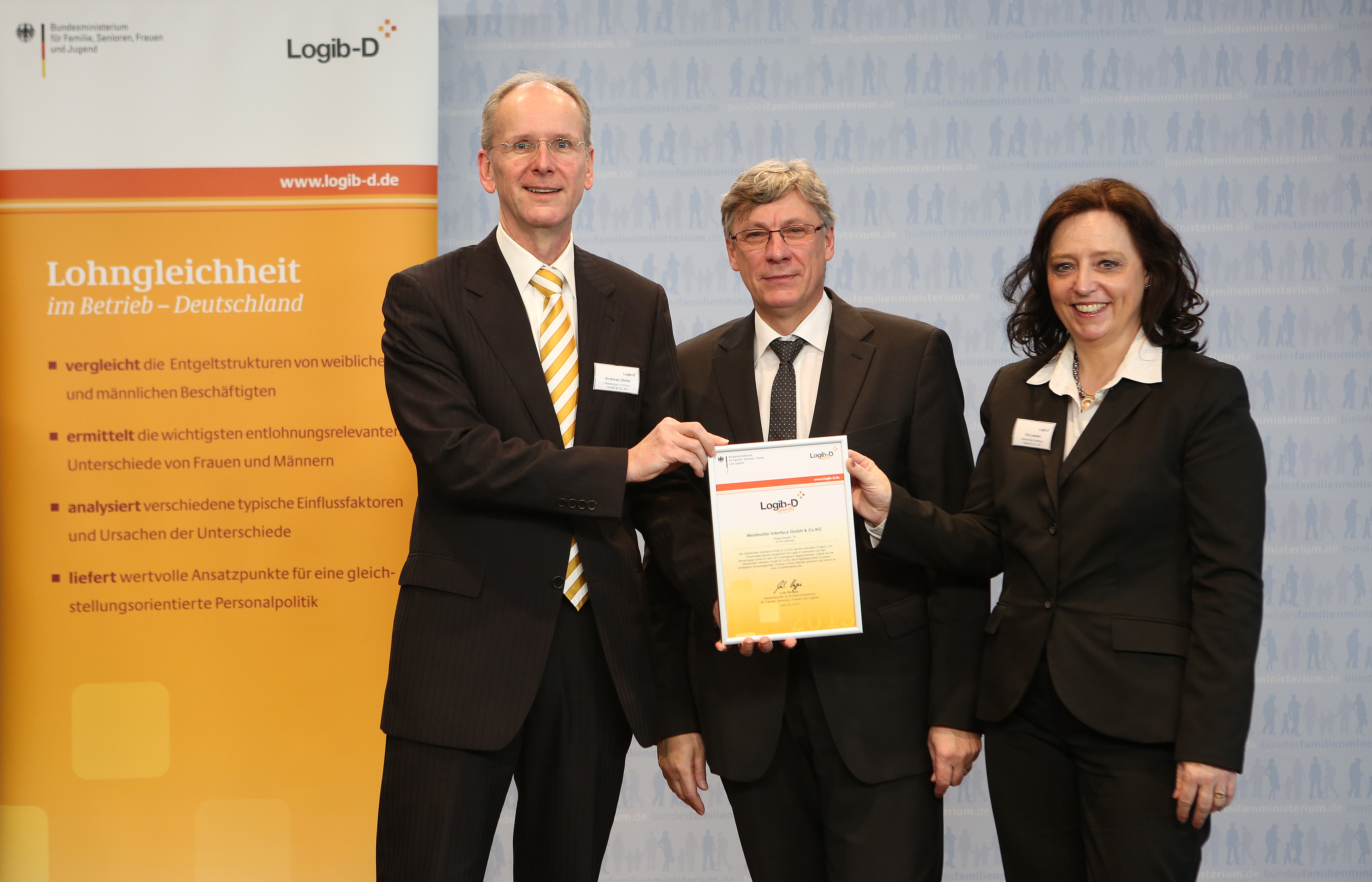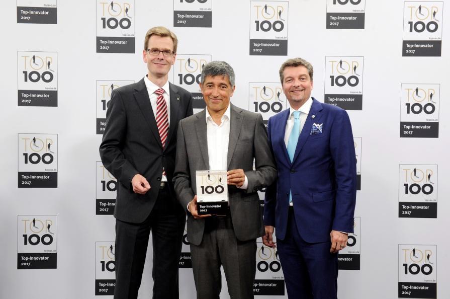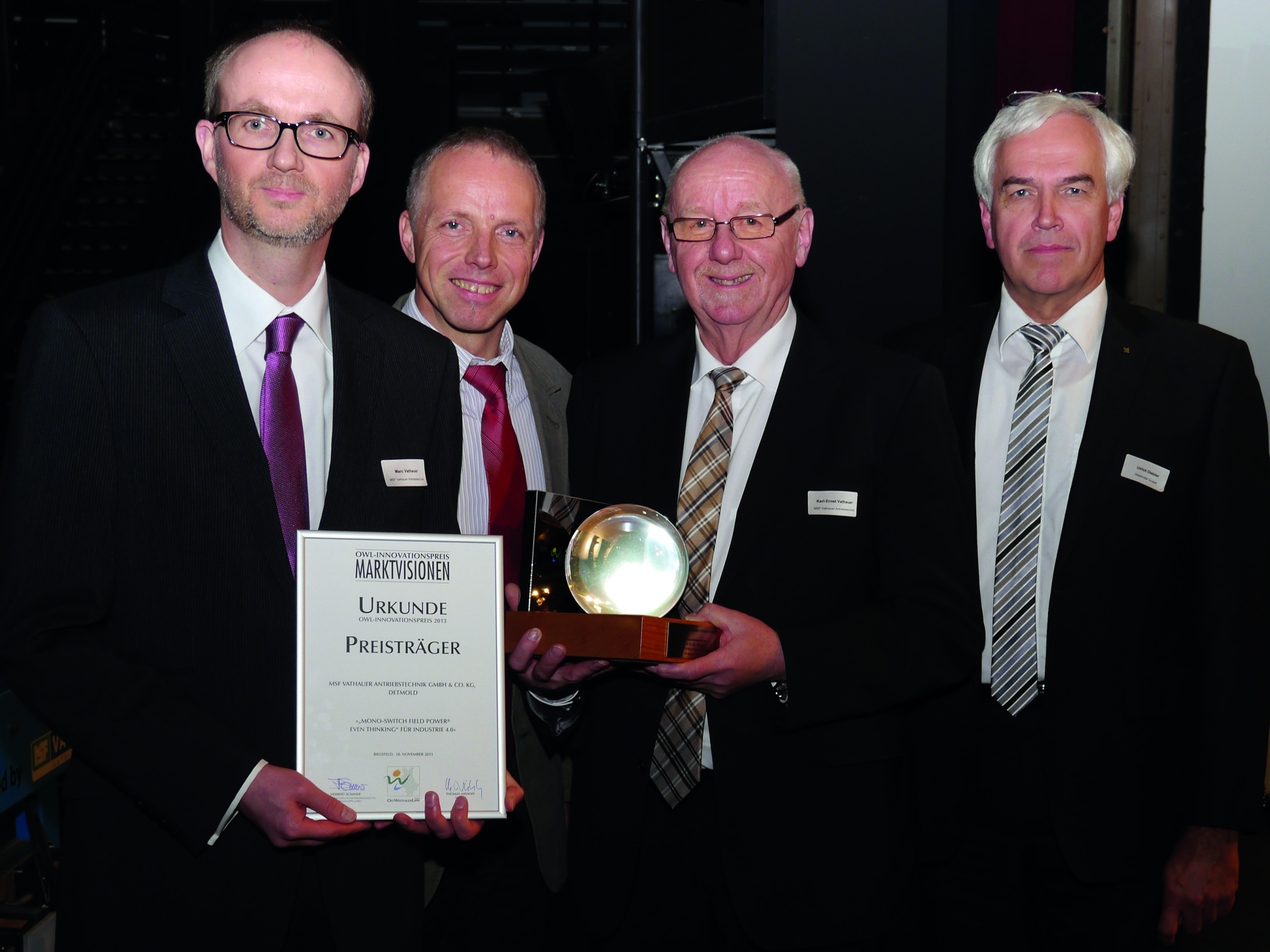 Jose Carlos Alvarez Tobar, Chief Marketing & Sales Officer; Dr. Timo Berger, Managing Director / Executive Vice President Region CE; Franziska Klein, Marketing Distribution; Roger Kroon, Vice President Global Distribution Management; Berndt van Nüss, Manager Catalogue, Online- and Tools Distributors von Weidmüller und Pirjo Niemi, VP Strategic Marketing, B2B Europe, Andreas Lippert, Vice President, B2B DACH; Michael Schlagenhaufer von Conrad Electronic bei der Übergabe des Awards
