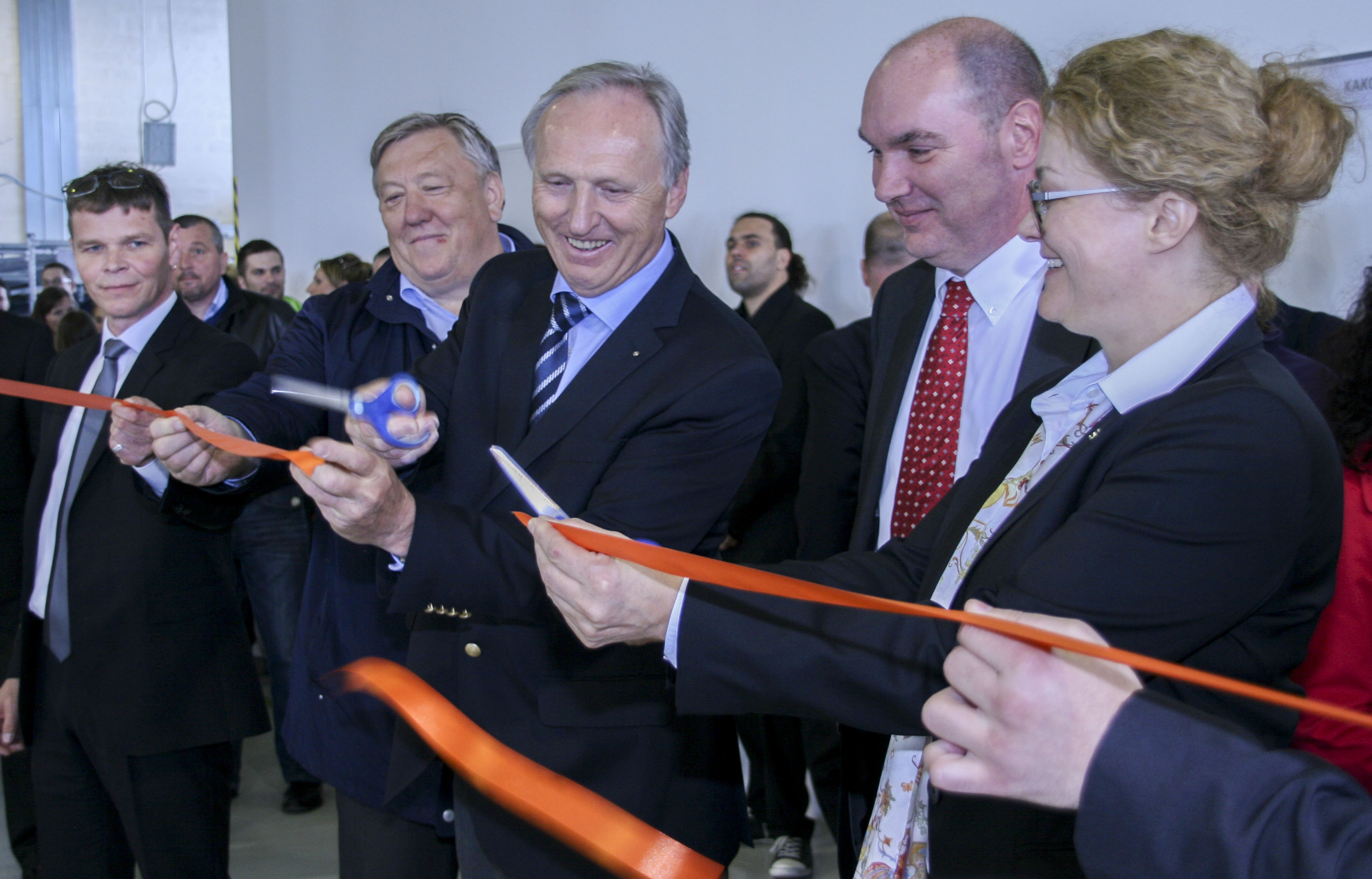 Das gemeinsame Fertigungswerk für Komponenten zum Schutz gegen Blitze und Überspannungen des Joint Ventures von Weidmüller und Iskra Zaščite in Logatec, Slowenien, wurde im Rahmen einer feierlichen Eröffnung in Betrieb genommen (vl.n.r.: Matjaž Milharčič, Werksleiter, Berto Menard, Bürgermeister von Logatec, Dr. Otmar Zorn, Geschäftsführer von Iskra Zaščite, Michael Höing, Leiter Division Elektronik bei Weidmüller und Elke Eckstein, Vorstand Operations bei Weidmüller)