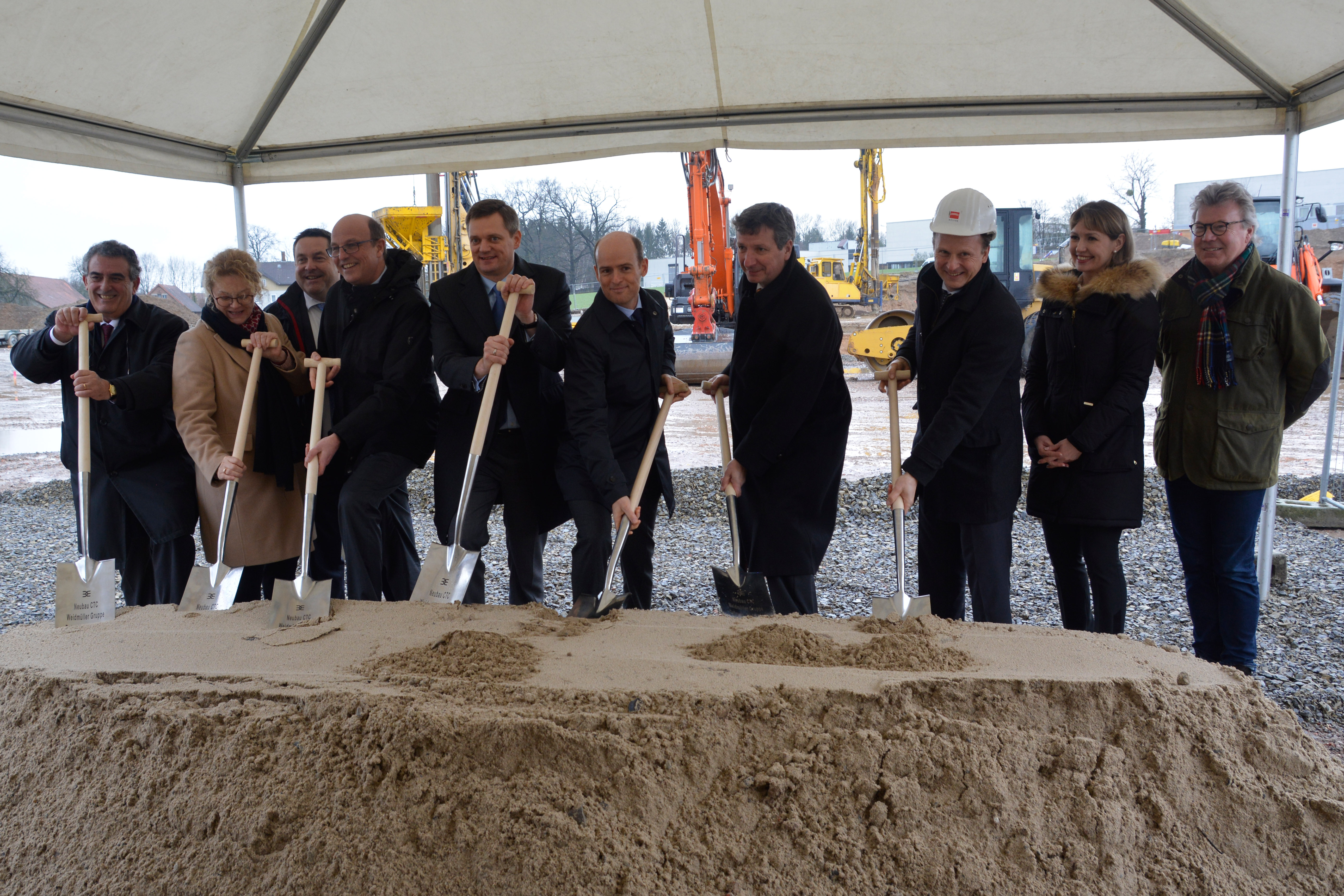 Spatenstich Customer & Technology Center (v.l.n.r,): José Carlos Álvarez Tobar (Vertriebsvorstand), Elke Eckstein (Vorstand Operations), Dr. Axel Lehmann (Landrat Kreis Lippe), Rainer Heller (Bürgermeister Detmold), Jörg Timmermann (Finanzvorstand), Christian Gläsel (Aufsichtsratsvorsitzender), Dr. Peter Köhler (Vorstandsvorsitzender), Markus Sommer (Köster GmbH), Helene Derksen-Riesen (Leiterin Facility Management), Helmut Merwitz (Architekt)
