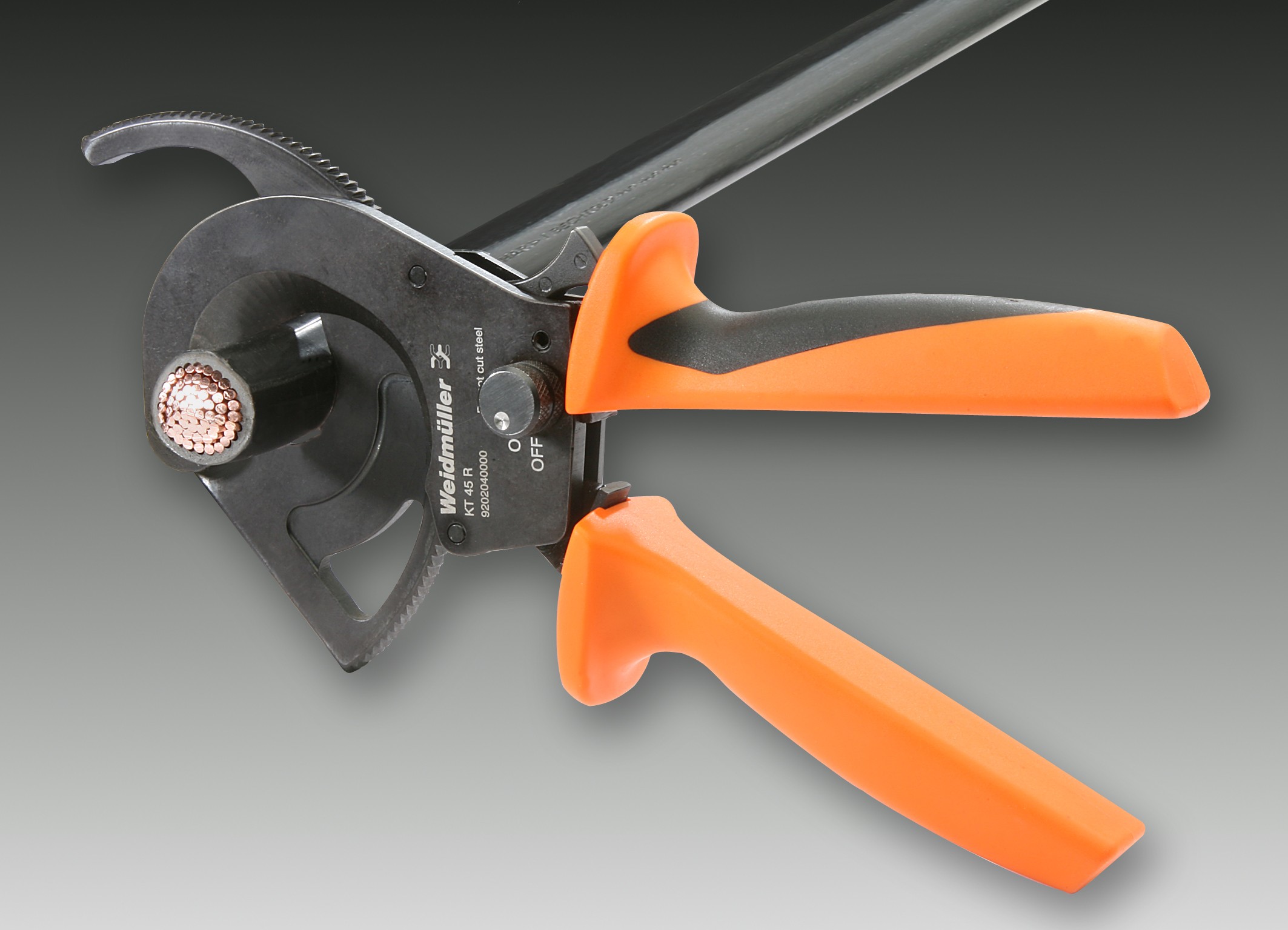 Auf das Trennen von Kupfer- oder Aluminiumkabeln ist Weidmüller spezialisiert: Die Produktpalette reicht vom Schneidwerkzeug für kleine Querschnitte mit direkter Kraftübertragung bis hin zu Schneidwerkzeugen für große Durchmesser. Die Schneidwerkzeuge KT 45R, KT 55 und KT 80 sind für das Schneiden großer Querschnitte mit Außendurchmessern von 45, 55 und 80 mm ausgelegt. Die maximale Schneidleistung bei feindrähtigen Kupferkabeln beträgt 400 (KT 45R), 500 (KT 55) und 630 mm2 (KT 80) Leiterquerschnitt. Die Schneidwerkzeuge zeichnen sich durch eine besonders markante Schneidform aus, die einen ziehenden Schnitt erlaubt. Dank dieser besonderen Schneidform lassen sich für das Schneiden großer Querschnitte kompaktere Werkzeuge konstruieren. Das Schneidresultat ist ein hochwertiger, glatter und gerader Schnitt ohne Leiterverformung - also ohne Abquetschung oder Abscherung. Bei den mit einer Hand bedienbaren KT 45R und KT 55 reduzieren der mechanische Antrieb und die spezifisch konstruierte Schneidenform die erforderlichen Handkräfte eindrucksvoll. Beim KT 80 erfolgt die optimale Hebelübersetzung durch Exenterantrieb.