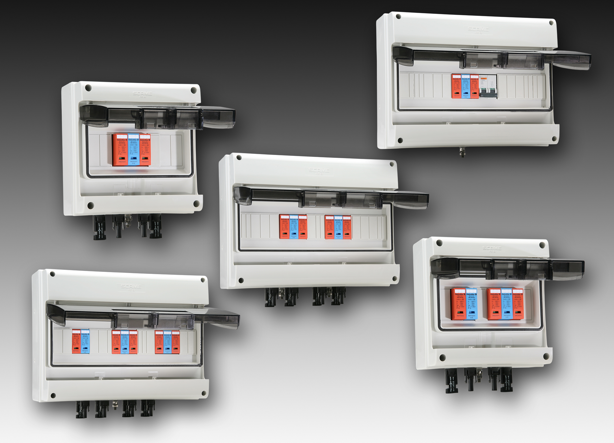 Im Einzelnen: Die Weidmüller "PV-Box DC bzw. DC2" eignet sich zum Schutz der DC Seite von einem bzw. zwei Solarstrings, jeweils Anschluss über MC4 Stecker mit Uoc: < 1000V. Die "PV-Box AC/DC bzw. AC/DC2" dient dem Schutz der DC-Seite von einem bzw. zwei Solarstrings (mit Anschluss über MC4 Stecker mit Uoc: < 1000V) und des abgehenden AC-Anschlusses. Mit der "PV-Box Multistring" schließen Anwender acht Solarstrings mit Uoc: < 1000V über Messtrennklemmen an, die mit dem Überspannungsschutz verbunden sind. Der in dieser PV-Box integrierte DC-Schalter kann Ströme bis zu 50A abschalten. Der Anschluss der Strings erfolgt direkt an den Messtrennklemmen. Durch Öffnen und Schließen der Messtrennklemmen lassen sich Messungen sicher und rationell durchführen. Die transparente Schutzklappe aller PV-Boxen ist von vorne aufklappbar und so bei Bedarf leicht zugänglich.
