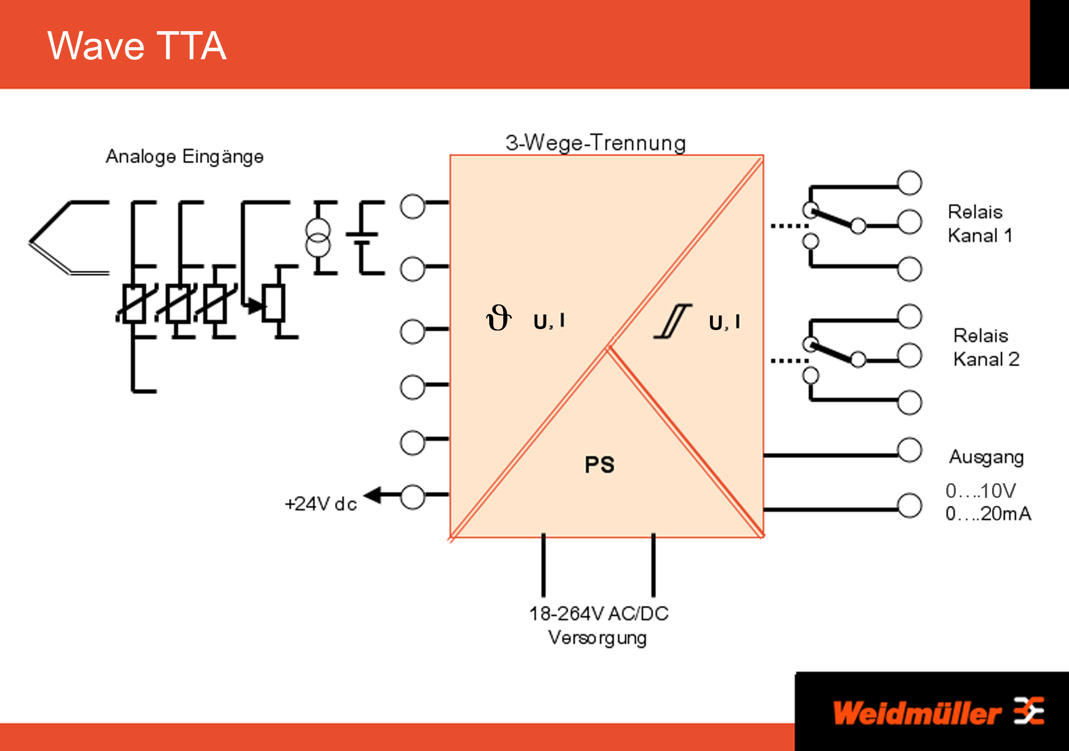 (pressebox) (Detmold, 03.04.2009) Weidmüller bietet mit dem neuen Wave TTA (Transmitter Trip Amplifier) einen universellen Signalwandler und Grenzwertschalter an. Er gehört zur bekannten Analogwandler-Familie WAVESERIES, die in der Prozess- und Industrieautomation bereits breite Anwendung findet. Der Wave TTA ist Trenner, Wandler, Geber, Linearisierer und Grenzwertschalter in einem Modul. Die Ein- und Ausgänge sind via PC und einem Schnittstellenmodul individuell konfigurierbar. Der WaveTTA besitzt eine Weitbereichs-Spannungs-Versorgung und arbeitet präzise sowie stabil mit allen gängigen Sensortypen. Ob Temperatursignale, wie etwa Widerstandsthermometer oder Thermoele-mente, ob Potentiometer, Frequenzgeber oder DC Spannungs- und Stromsignale - der Wave TTA verarbeitet unterschiedlichste Eingangssignale. Das Modul trennt, überträgt und linearisiert diese Sensorsignale und liefert ausgangsseitig genormte analoge Strom- und Spannungswerte. Zwei Relaiskontakte mit einstellbarer Schaltschwelle stehen für Alarmfunktionen zur Verfügung. Das Modul zeichnet sich durch eine hohe Meßgenauigkeit aus. Der Wave TTA (Schutzart IP 20) ist kompakt gebaut (92,4 mm x 112,5 mm x 45 mm, L x H x B) und in einem Umgebungstemperaturbereich von -40 bis 70°C uneingeschränkt einsatzfähig. Die beantragten Zulassungen umfassen C1D2 und Zone 2 (ATEX) für explosionsgefährdete Bereiche.