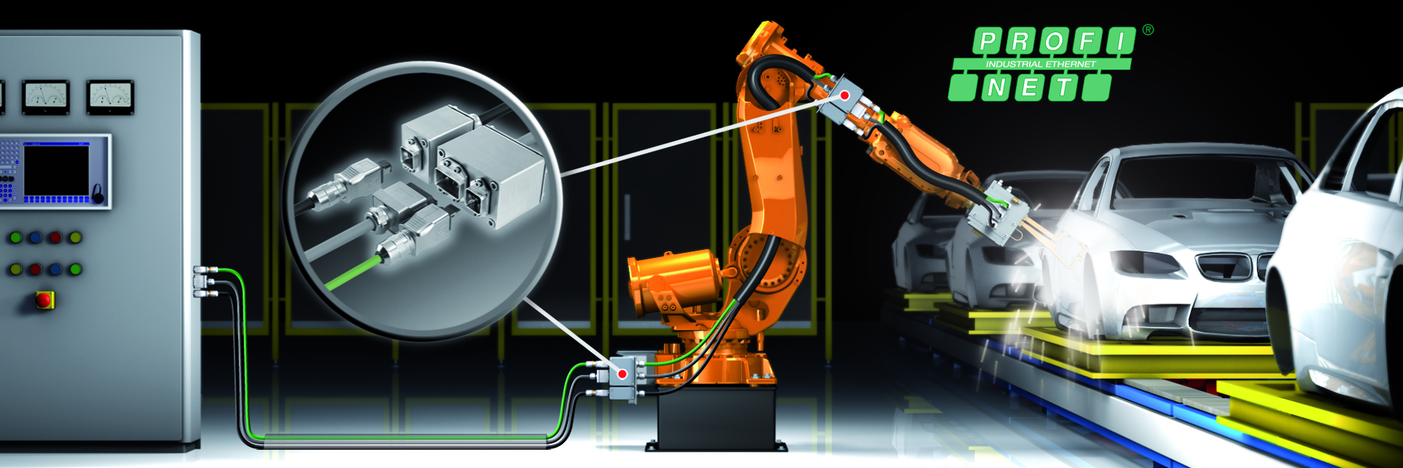 PushPull-Steckverbinder und neuartige Anschlussdosen bilden die Basis für einen neuen Verkabelungsstandard in der Automobilindustrie. Die neuen PushPull Steckverbinder sind Bestandteil des neuen Energie-Signale-Daten- Installations-systems von Weidmüller für die Automatisierungsinitiative der deutschen Automo-bilhersteller (AIDA*). Auf dieser Basis entstand der Verkabelungsstandard für die PROFINET-Installationen in der Automobilindustrie. Er besteht aus den Steckver-bindern der Variante 14, ausgestattet mit zwei verschiedenen Einsätzen für Daten und Signale und dem PushPull Steckverbinder für die Energie. Das System komplettiert eine Doppelanschlussdose für die Energie (24V) und Daten (Ethernet), sowie einer Einfachanschlussdose für Signale. Steckverbinder und Anschlussdosen sind mit RJ45-Modulen ausgestatte. Durch die Verwendung von RJ45-Modulen mit STEADYTEC® -Technologie wird die Anzahl der Steckstellen in einem Channel erhöht. Die PROFINET-Spezifikation sieht eine Begrenzung von max. sechs Steckstellen vor. Jede zusätzliche Steckstelle in einem Kategory 5 Channel erhöht die elektrischen Verluste und beeinträchtigt die gesamte Übertragungsstrecke. Weidmüller setzt auf RJ45-Komponenten der Kategorie 6A, da diese gegenüber Kategory 5 Komponenten eine deutlich höhere Systemreserve bei der Datenübertragung besitzen. Der PushPull-Steckverbinder für die Energieleitungen ist mit einem 5poligen Einsatz für 16 A ausgestattet, der PushPull-Signalsteckverbinder mit einem 10poligen Hybrideinsatz.