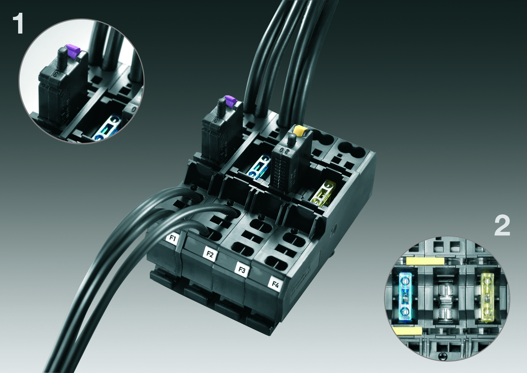 Kfz-Flachsicherungen oder ETA-Sicherungsautomaten vom Typ 1170 haben sich als kompaktes Schutzorgan im Nutzfahrzeug- und Baumaschinenbau bewährt. Auch im Maschinen- und Anlagenbau stellen sie eine interessante Alternative zu herkömmlichen Sicherungsautomaten dar. Die neuen Sicherungsverteilungsklemmen vom Typ "ZSI 2x6/4x2.5" sind für eine sichere und problemlose Aufnahme dieser Schutzelemente konzipiert. Die innovativen Reihenklemmen weisen zwei Funktionen in einem Produkt auf: Schützen und Verteilen.