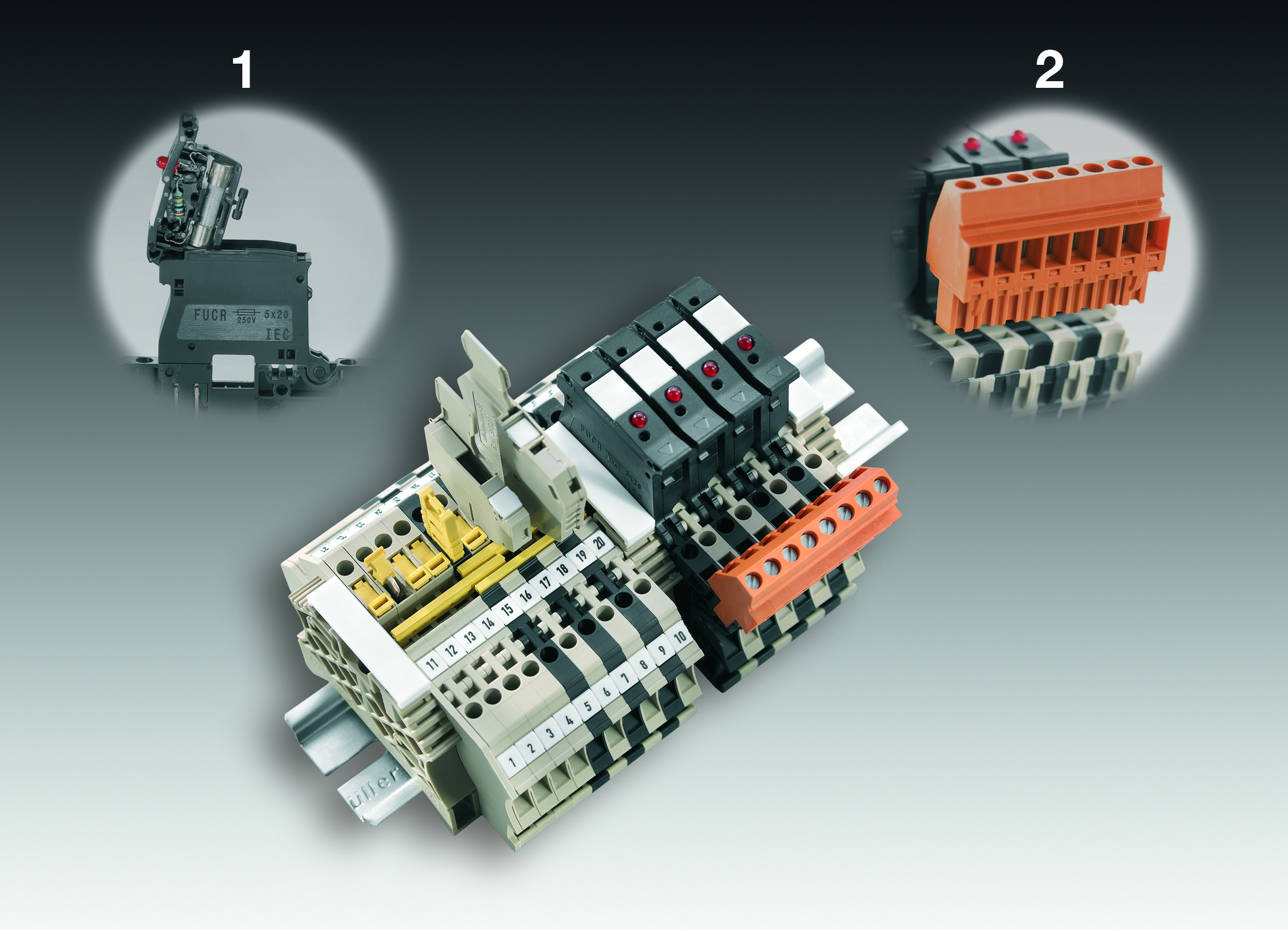 Bild 1: Weidmüller Reihenklemmenfamilie "WMF": Die neuen Reihenklemmen ermöglichen ein einfaches sowie präzises Rangieren und Verteilen in prozesstechnischen Anlagen und der Energieerzeugung. Detail 1: Schneller und präziser Sicherungswechsel durch schwenkbarem Sicherungshebel. Detail 2: Einfach die "BLZ"- Steckverbinder auf die Reihenklemmen stecken - Plug & Play - das spart wertvolle Verdrahtungszeit.