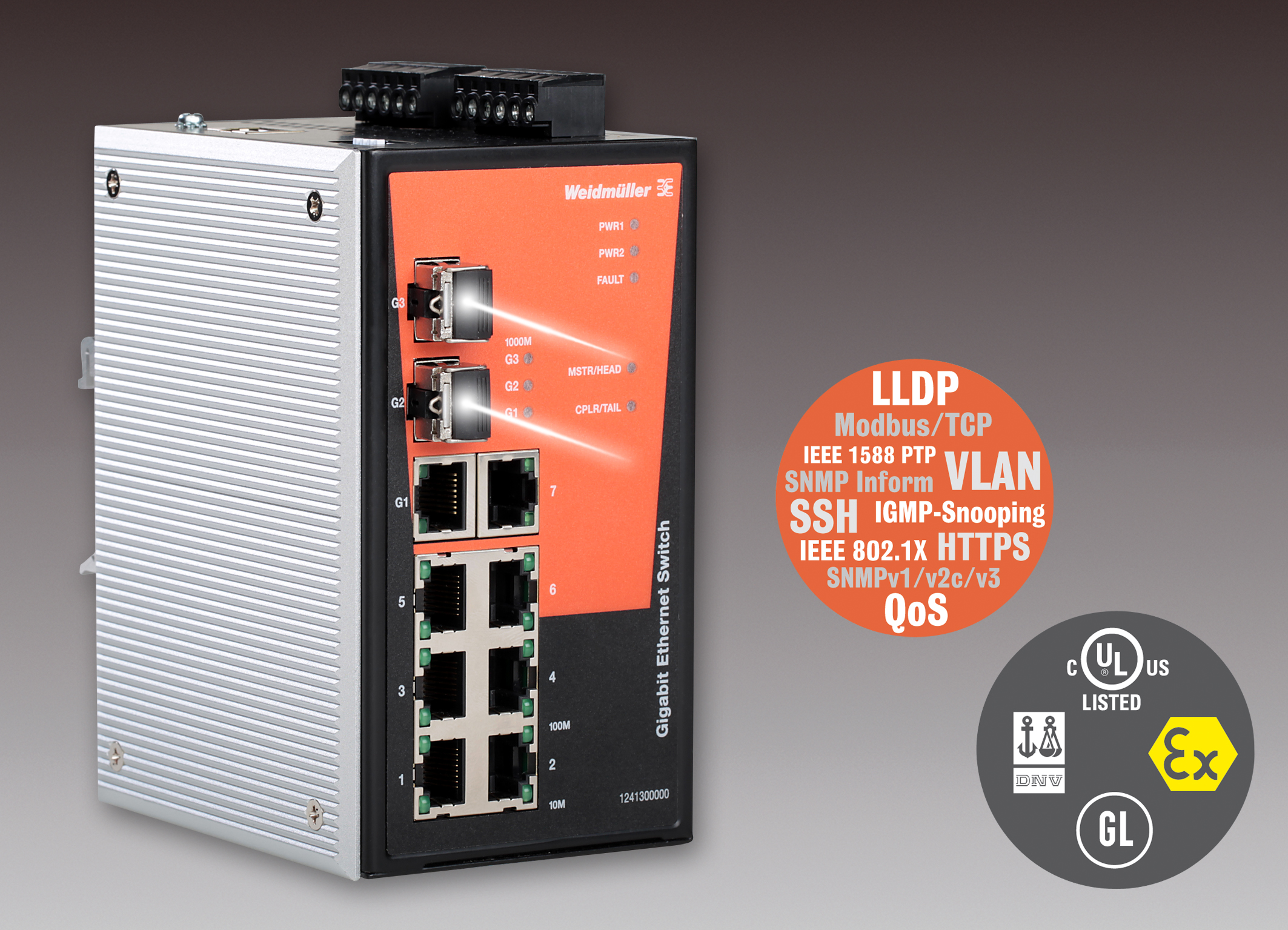 (pressebox) (Detmold, 04.08.2011) Weidmüller has introduced three new product lines of switches - Basic Line, Value Line and Premium Line - to satisfy all communication requirements in industrial environments. Weidmüller's new managed Gigabit switches from the Premium Line family of products have been designed for high-end applications: featuring sophisticated management and security functions they are suitably equipped to establish cutting-edge network solutions. The devices can be supplied with Gigabit Ethernet or Fast Ethernet ports. One version is equipped with Fast Ethernet as well as Power over Ethernet ports. These devices increase the reliability and availability of industrial networks thanks to integrated ring redundancy technology (recovery time ? 20 ms). Gigabit versions are designed for use in networks with large volumes of communication data, and optional SFP transceivers offer maximum flexibility. These features ensure the Gigabit Ethernet switches are predestined for communications-intensive applications in distributed sub-networks as well as for high traffic loads in backbone solutions. Managed Gigabit Ethernet switches are equipped with two integrated Gigabit Ethernet ports plus 16 Fast Ethernet ports for copper and fibre-optic solutions. They support all customary protocols of TCP/IP-based industrial networks (for example, Ethernet/IP, Modbus/TCP). An external back-up and configuration module supports simple exchange and retrieval of a switch configuration to maintain high levels of plant availability. Managed Gigabit Ethernet switches have the following approvals and certificates of conformity: CE, FCC, UL/cUL Class I Div. 2 / Atex, DNV / GL.