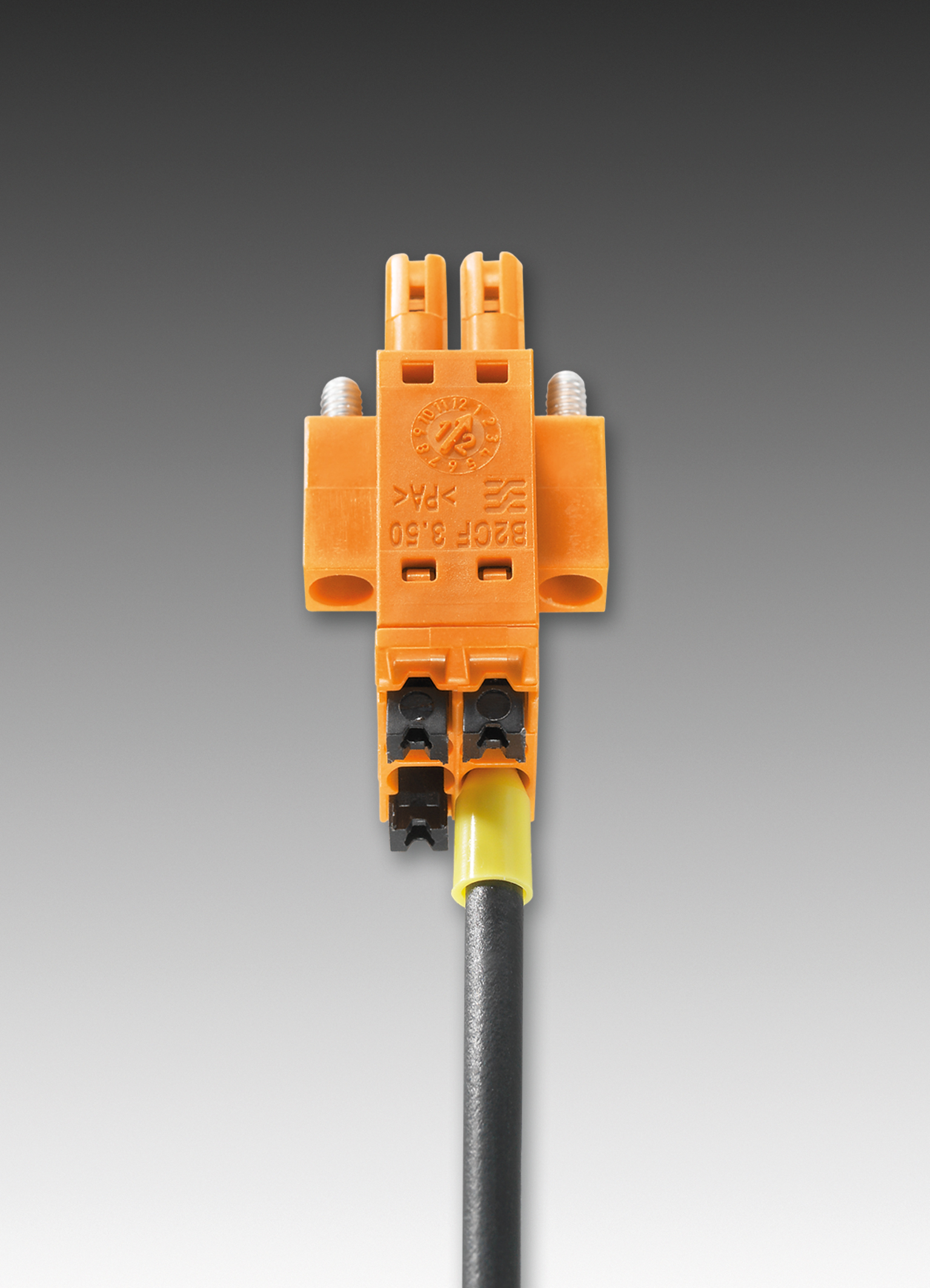 Mit OMNIMATE® Signal B2CF 3.50 präsentiert Weidmüller einen zweireihigen Steckverbinder im metrischen Leiterplattenraster 3,50 mm und Push In-Anschlusstechnik am Buchsenstecker sowie fingersicherer Stiftleiste. Der neue Steckverbinder ermöglicht 30% kleinere Lösungen, im Vergleich zu Lösungen im Raster 2,5 mm. Der orangene Buchsenstecker mit und ohne seitlichen Flansch sowie mit schwarzem Löseriegel nimmt in seinem Push In-Anschlusssystem ein- und feindrähtige Leiter mit und ohne Aderendhülse von 0,14 bis 1,5 mm2 auf. Leiter, die mit Aderendhülsen mit Kunststoffkragen versehen sind, lassen sich bis 1,0 mm2 problemlos anschließen. Das wartungsfreie Push In-Federanschlusssystem beeindruckt durch einfaches und sicheres Handling sowie einer sehr geringen Verdrahtungszeit. Abisolierte massive Leiter bzw. feindrähtige Leiter mit Aderendhülsen werden einfach bis zum Anschlag in die Klemmstelle gesteckt. Fertig! Feindrähtige Leiter werden durch Öffnen der Klemmstelle - Push Button betätigen - angeschlossen. Eine eindeutige und übersichtliche Betriebsmittelkennzeichnung gewährleisten gut lesbare Markierer am "Pusher" von jeder Klemmstelle. Werkzeuglos und Baugruppen schonend erfolgt mit dem Löseriegel das Ver- und Entriegeln zwischen Buchsenstecker und Stiftleiste. Die hochtemperaturfeste, zweireihige Stiftleiste ist in der Bauform 90° und 180° Grad sowie seitlich geschlossen oder auch mit Lötflansch erhältlich. Mit einer Stiftlänge von 1,5 oder 3,2 mm sind die Stiftleisten für Reflow- und Wellenlötanwendungen konzipiert. Die Bemessungsdaten der Stiftleisten sind: 200 V / 10 A (IEC) und 150 V / 10 A (UL); die des Buchsensteckers 320 V/10 A (IEC) und 300 V / 10 A (UL). Die OMNIMATE® Signal B2CF 3.50-Familie ist in den Polzahlen 4 bis 36 Pole erhältlich. Umfangreiches Zubehör, wie Markierer, Flutlichtanzeige, Zugentlastung und Kodierungselemente rundet das Angebot ab. Der neue Buchsenstecker ist kompatibel mit den bewährten Stiftleisten der Omnimate® Familien S2L 3,50; S2L-SMT 3,50 und S2LD-THR 3,50.