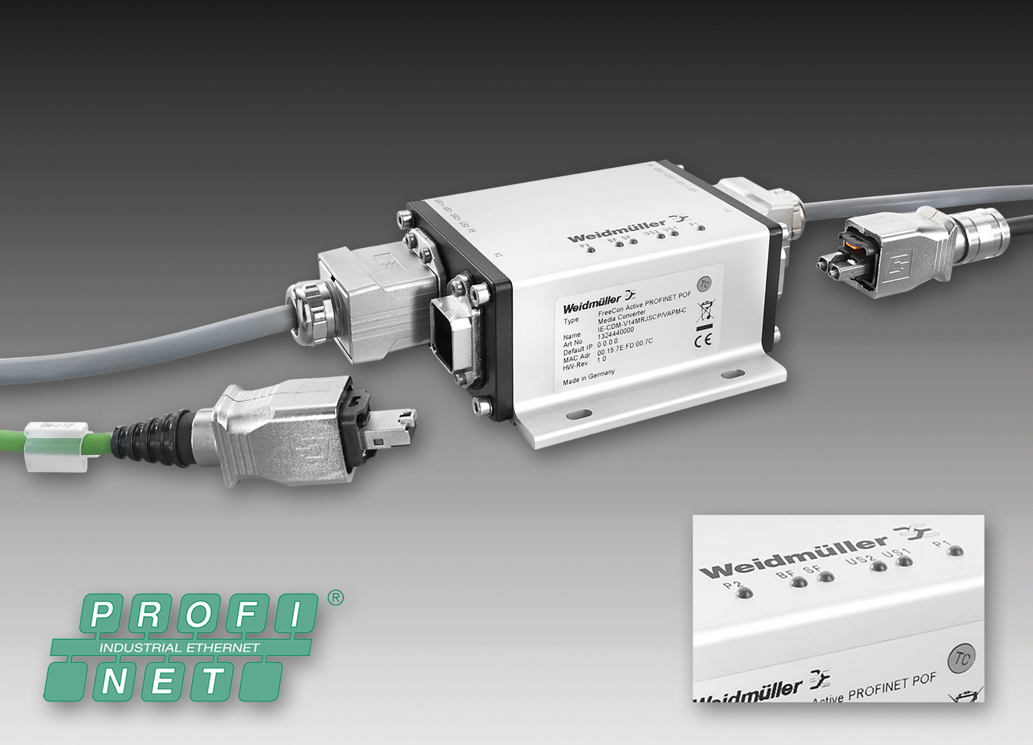 Den FreeCon Active PROFINET Medienkonverter (IP 65) schützt ein robustes Alu-Profil, der Deckel besteht aus lackiertem Zinkdruckguss. Diverse, gut sichtbare LED-Anzeigen signalisieren den ordnungsgemäßen Gerätebetrieb oder visualisieren mögliche Fehler (P1: Port aktiv, P2: Port aktiv, SF: Sammelfehler, BF: Busfehler, US1: Spannung 1 (Elektronik), US2: Spannung 2). Der 780 Gramm leichte FreeCon Medienkonverter vereint in einem Modul die Datenkommunikation und die Energieversorgung (Datenschnittstelle: PROFINET PushPull SCRJ POF (V14), PROFINET PushPull RJ 45 (V14); Powerschnittstelle: PROFINET PushPull Power). Dies minimiert gleichermaßen die Lagerhaltung und den Zeitaufwand bei einem erforderlichen Austausch. Außerdem reduziert dies Instandhaltungskosten und erhöht die Anlagenverfügbarkeit.
