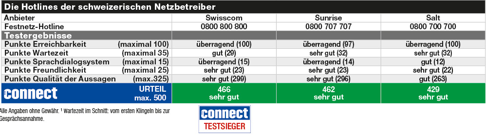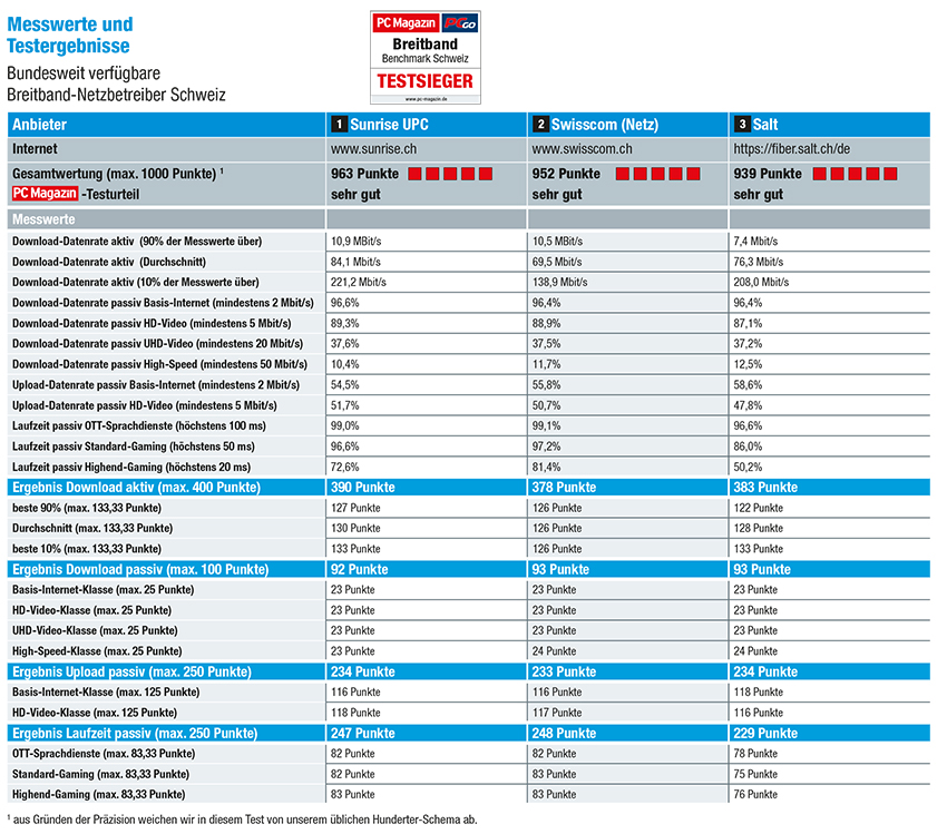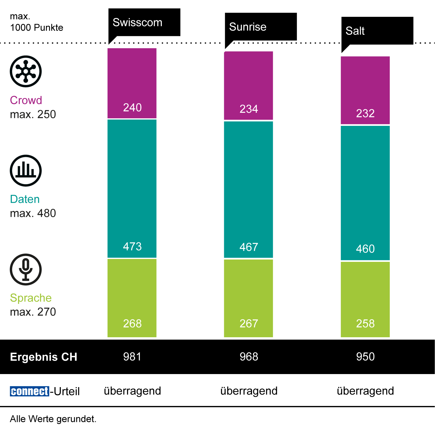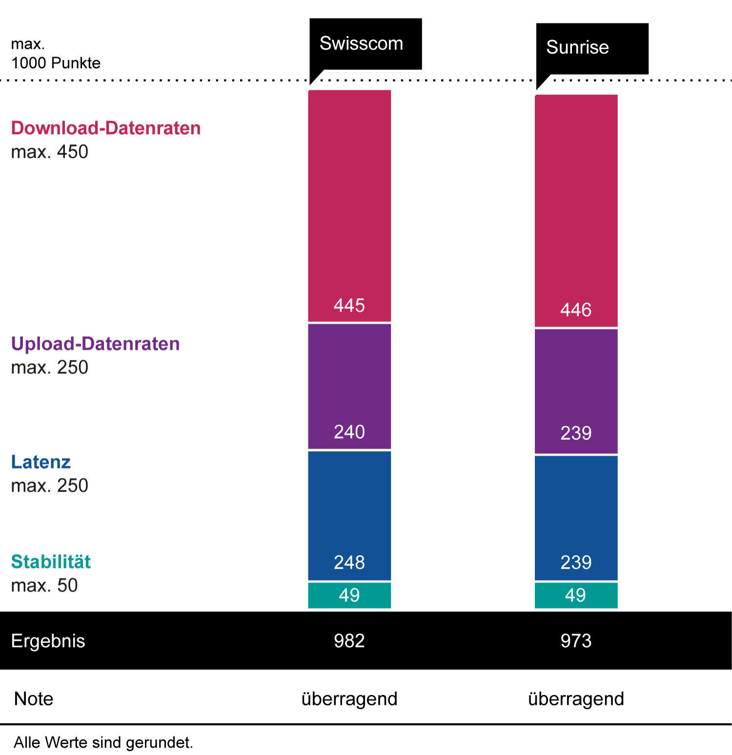 Zweimal die Note "überragend" – für den landesweiten Testsieger Swisscom und die zweitplatzierte Sunrise