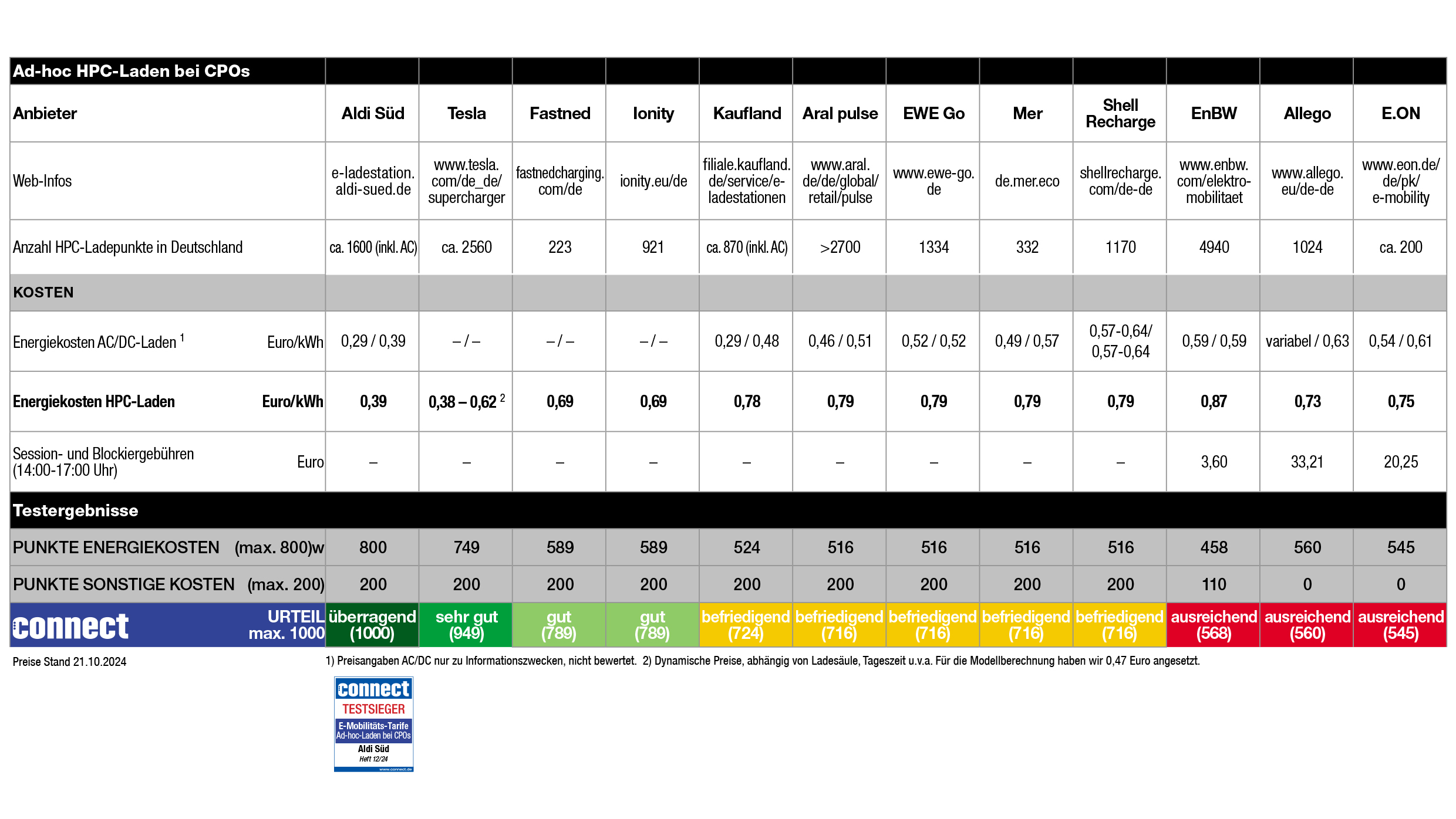 In der Kategorie HPC-Laden ist Aldi Süd Testsieger, Electra und Jet folgen auf Platz 2. In der Kategorie AC-Laden teilt sich Aldi Süd den ersten Platz mit Kaufland und Lidl