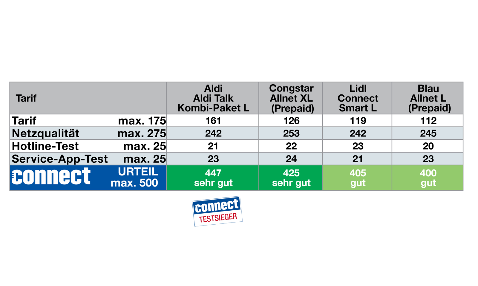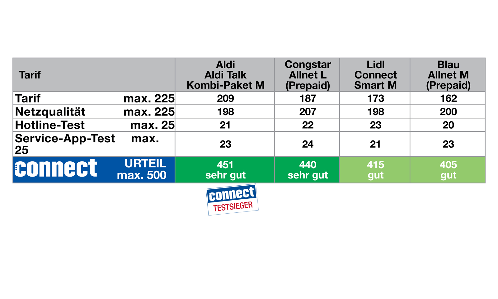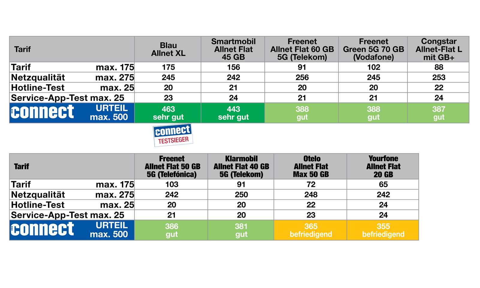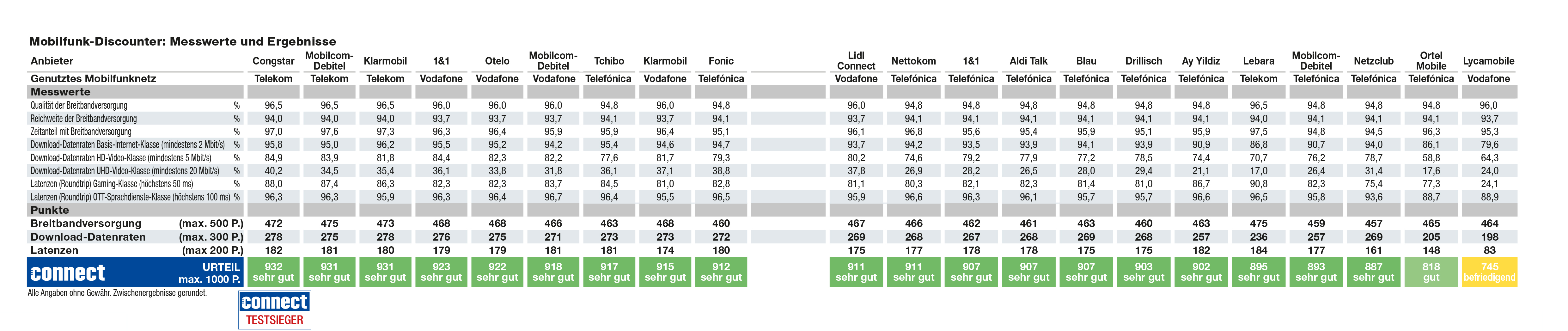 connect Service-Test Mobilfunk-Discounter: Platz 1 für Freenet, Platz 2 geht an Fraenk, Platz 3 an Ja Mobil.