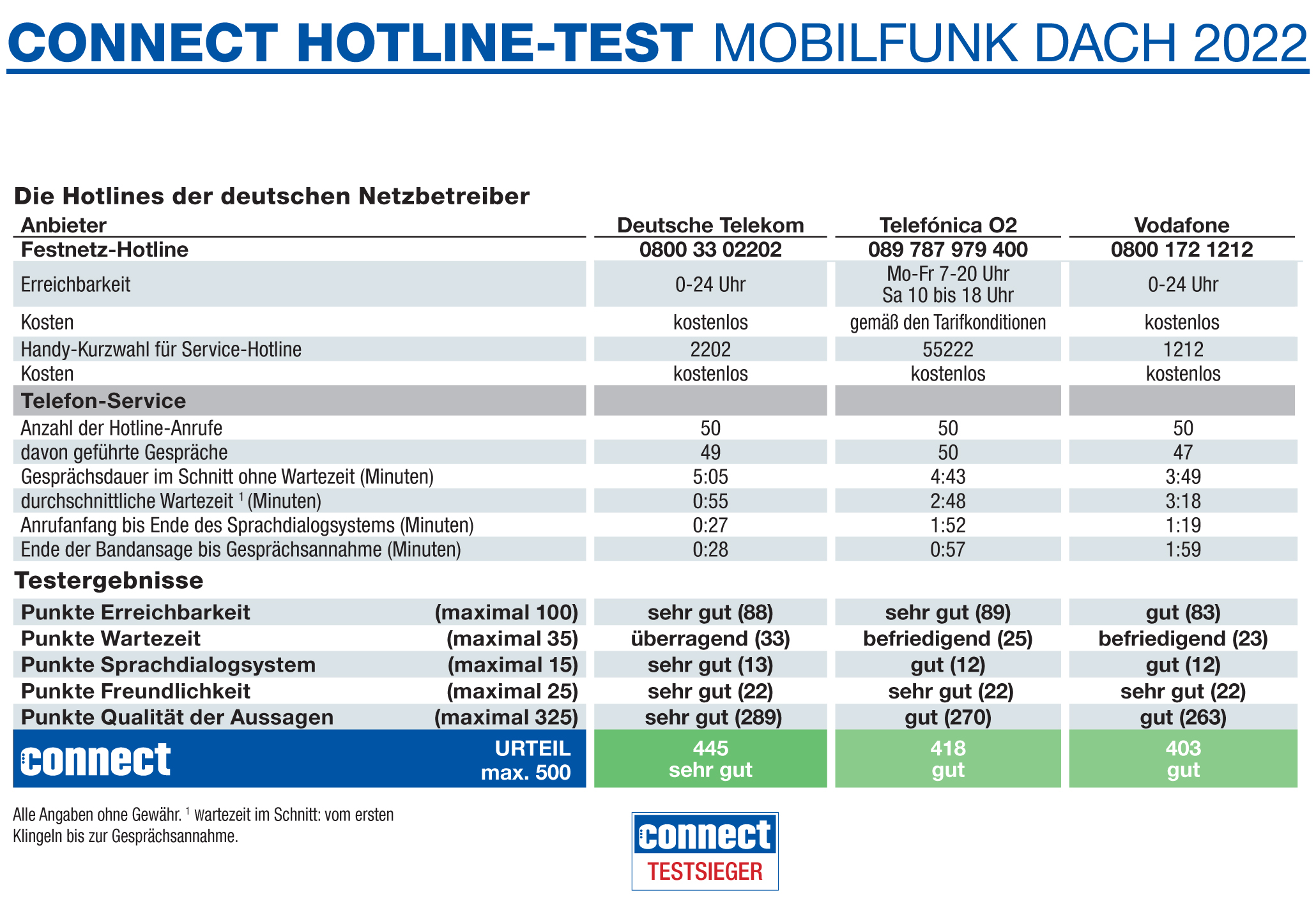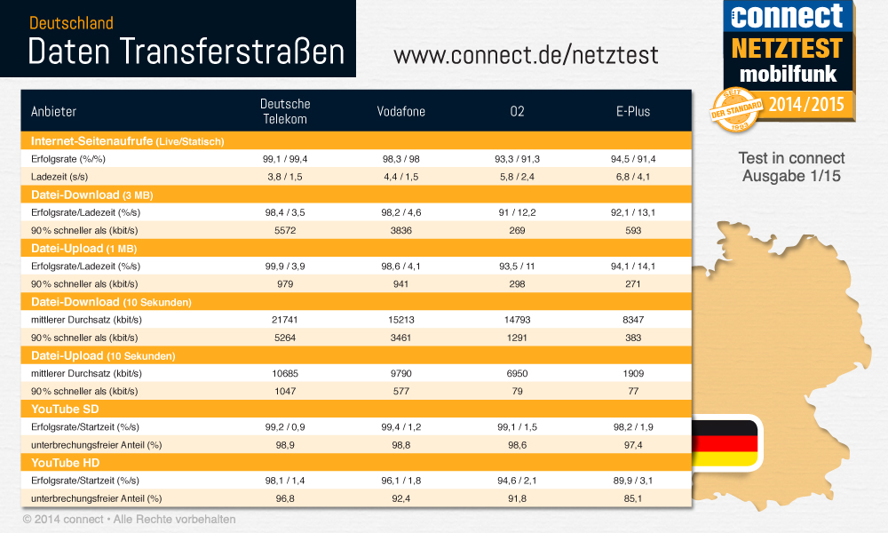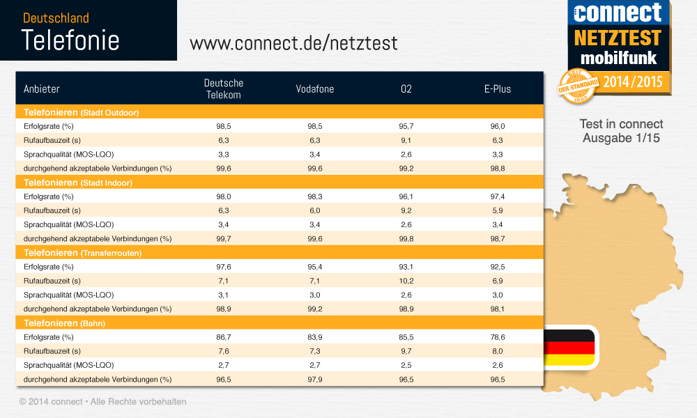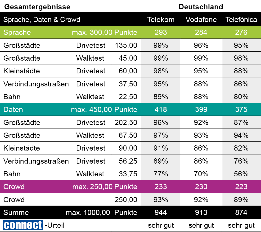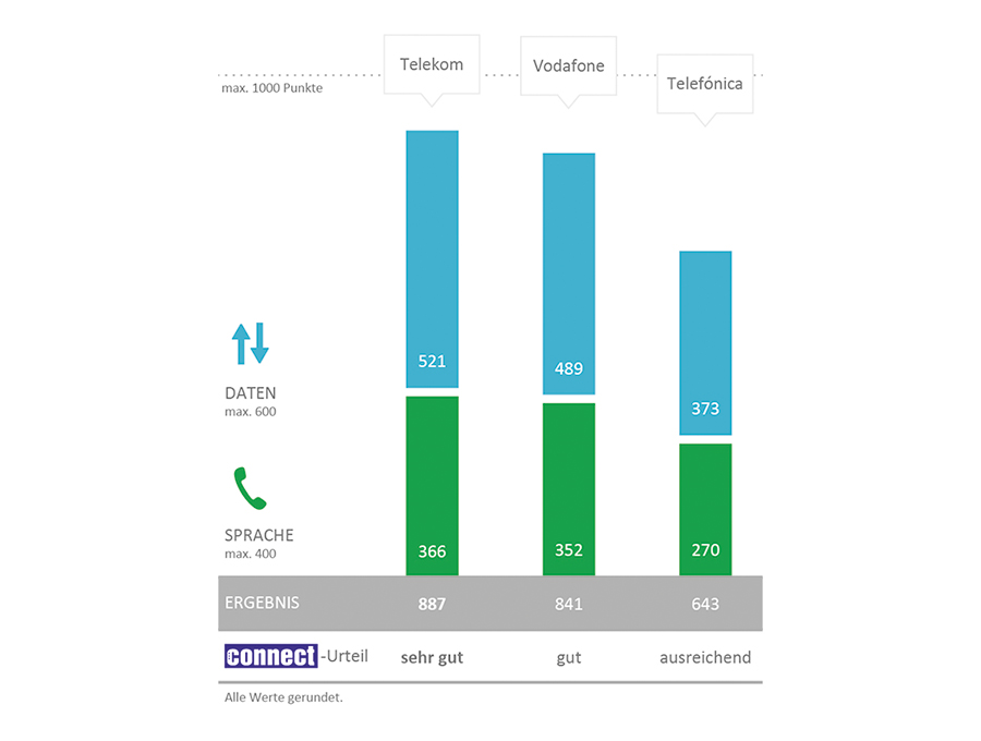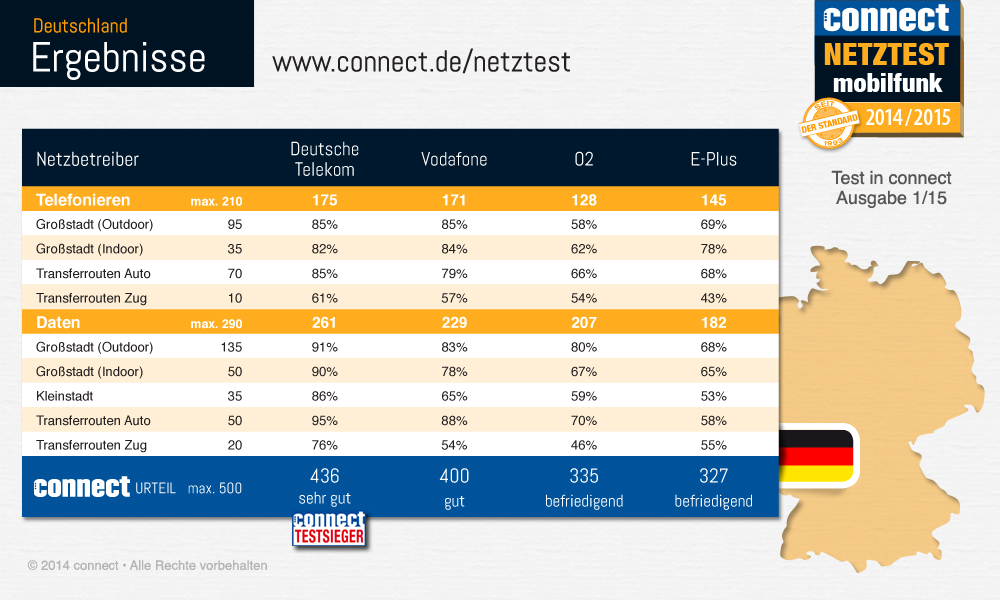 Telekom ist klarer Sieger des connect Mobilfunknetztests in Deutschland, Vodafone und O2/Telefónica teilen sich den zweiten Platz.