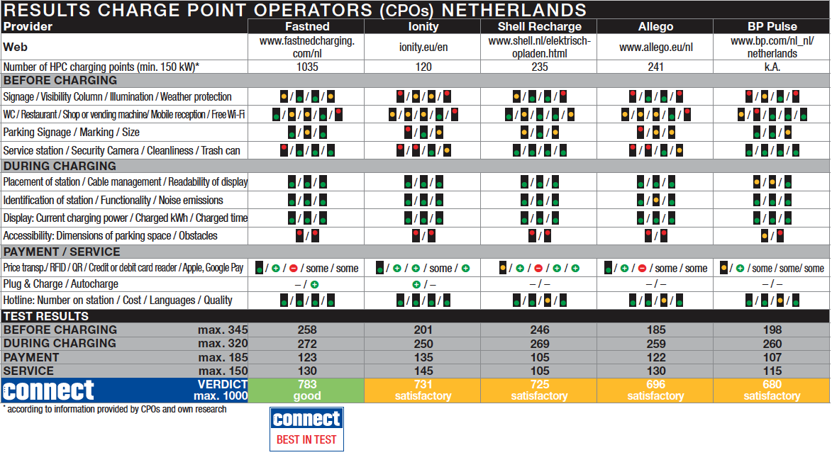 In the Netherlands, Fastned came in first place, followed by BP Pulse in second place and Shell Recharge in third place